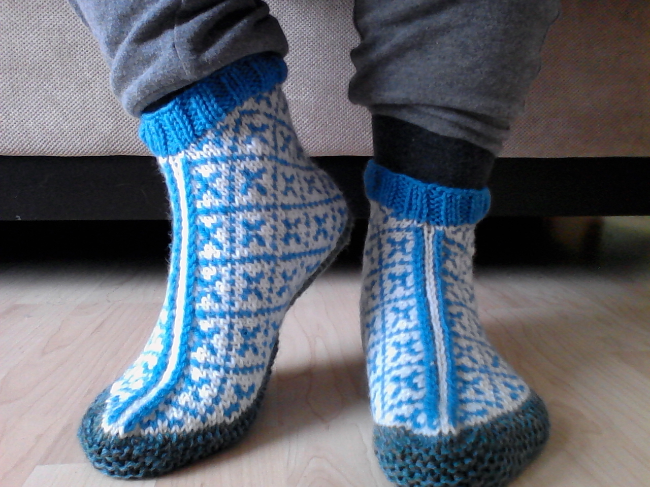 J’utilise 2 brins de laine à bas (avec du polyamide, ou nylon, si vous préférez) pour la semelle (De 150 à 200 mètres, double, donc la moitié si vous choisissez une laine plus grosse), et je poursuis avec de la vraie laine non-traitée(100 mètres pour la couleur principale et 100 mètres pour la couleur contrastante). La laine à bas les rendra durable et la vraie laine en fera de chaudes pantoufles. J’utilise des aiguilles double-pointes (2 pour la semelle et 5 pour le reste de la pantoufles), mais vous pourriez utiliser une aiguille circulaire en utilisant le magic loop, si vous préférez puisque les grilles montrent la moitié d’une pantoufles, puis l’autre. Avec des 3.5 mm (échantillon de 5.5 m au pouce), vous aurez une pantoufles pour dame de 6 à 7, et avec des 4 mm, vous aurez des pantoufles, 7.5 à 8.5, et encore plus grand, si vous utilisez des 4.5 mm.