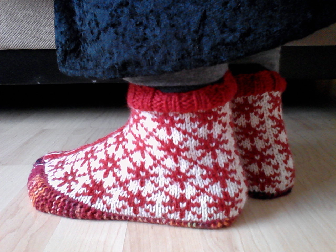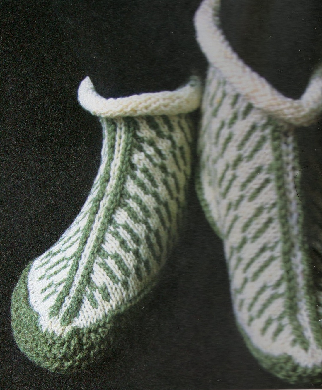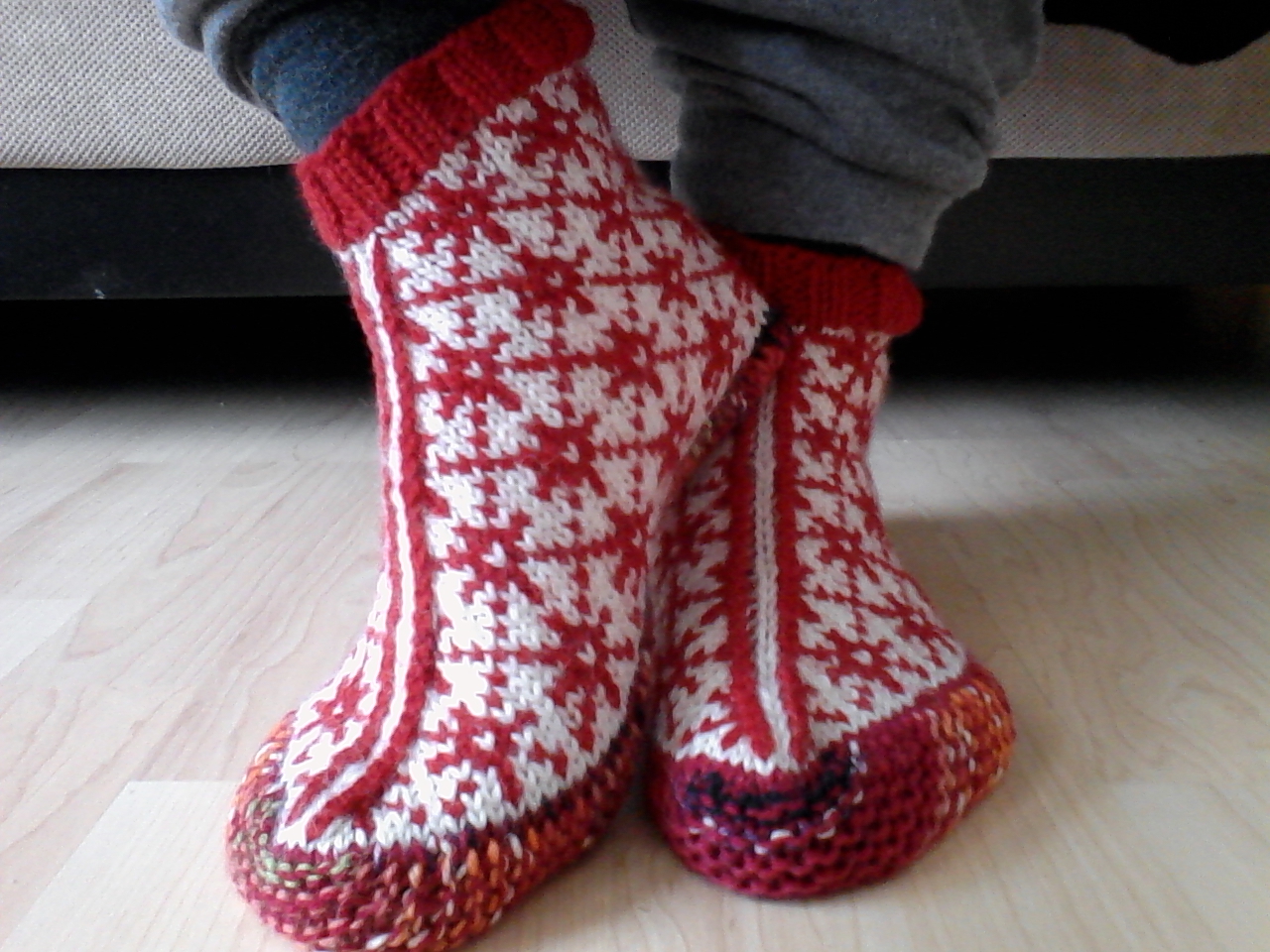 Quand j’ai donné mon cours sur Elizabeth Zimmermann, il y avait un modèle de pantoufles dont j’ai beaucoup aimé le principe. Mais, en plus d’être en anglais, les explications étaient brèves, et pour la grille du jacquard, seule une tricoteuse d’expérience pouvait s’y retrouver. Il fallait déduire soi-même les altérations du dessin à cause des diminutions. Et, de plus, malgré que j’avais le même échantillon que celui donné dans le patron, elles étaient petites.