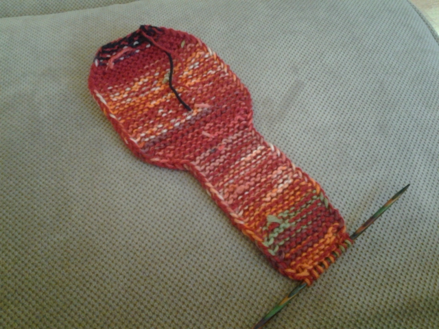 Distribuez vos m pour que le début soit à l’arrière du talon (en plein milieu des 8 m restantes de la semelle), et que vous ayez 28 m sur chaque aig (ou, séparé en 2, 56 m de chaque côté, avec une aiguille de 60 cm/32 » pour le magic loop). Coupez la laine de la semelle.