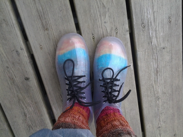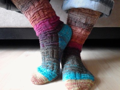 Et je me suis fait une paire de bas en Noro Taiyo socks, acheté sur un coup de tête, il n’y a même pas 2 semaines: je vais en faire un patron pour l’automne.