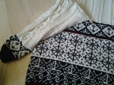 J’avance le chandail de Guylain qui a traîné quelques mois (beaucoup moins pire). C’est juste parce que c’est un peu long (forcément, un chandail), et que je n’avais pas beaucoup de temps pour ça avec les expos et les cours à préparer. Car, en fait, il est très plaisant à faire: jacquard et torsades, que demander de mieux?