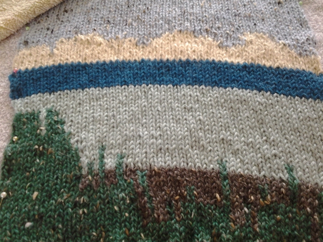Et je travaille sur ma veste Pointe-au-Père (les matins tôt, et le soir) qui est très agréable à faire. Un vrai tableau! C’est tricoter un dessin, colorier un tricot, bref, que du plaisir!