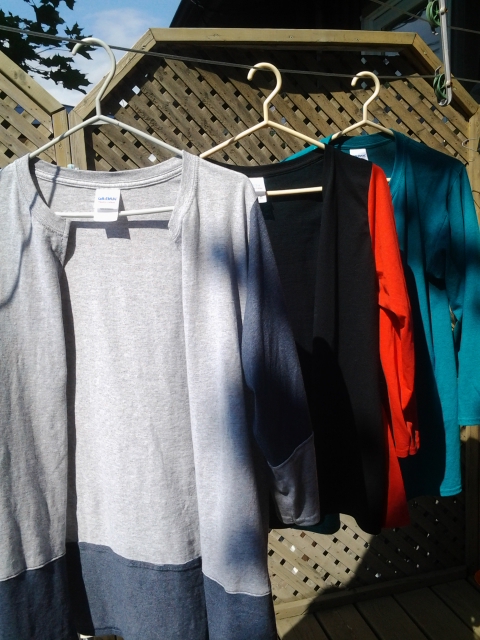 Je me suis amusée aussi, côté couture, à faire ce que j’appelle mes vestes-t-shirts. Avec 2 chandails à manches courtes achetés à rabais chez Michael’s, je fais une veste qui se met dans le fond d’un sac, ou autour des hanches: très pratique quand la température est incertaine pour une promenade. C’est que je traîne les 2 mêmes depuis plusieurs années. Pas besoin de vous dire qu’elle n’ont plus l’air très fraîches! J’en voulais d’autres. Ce n’est pas chic du tout, juste pratique, et…pas cher!
