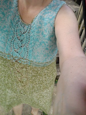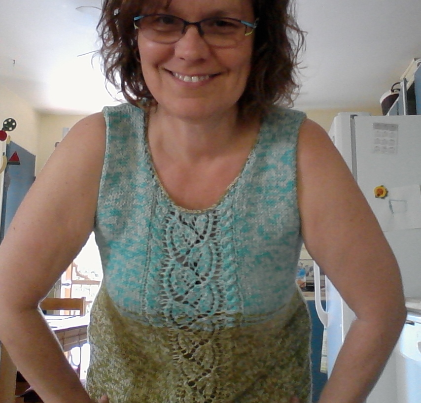 Après, on décide quelle longueur on veut, quelle largeur à quel endroit, on calcule un peu, on ajoute quelques mailles si on décide d’y mettre un motif central et…le tour est joué! Une simple finition en mailles serrées au crochet à l’encolure et l’emmanchure fait très bien la “job”.