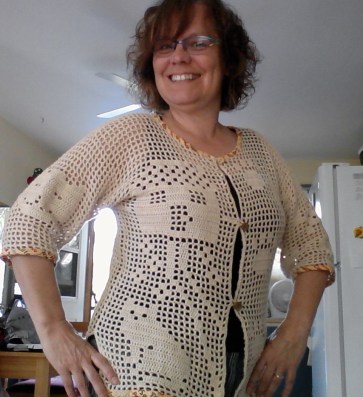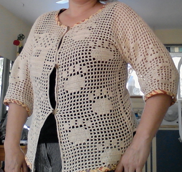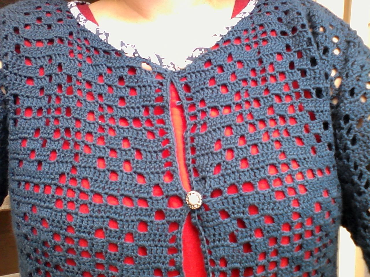 Celui que je vous présente aujourd’hui est mon 5ème patron de crochet-filet, et cette fois-ci, c’est une veste à manche 3/4.