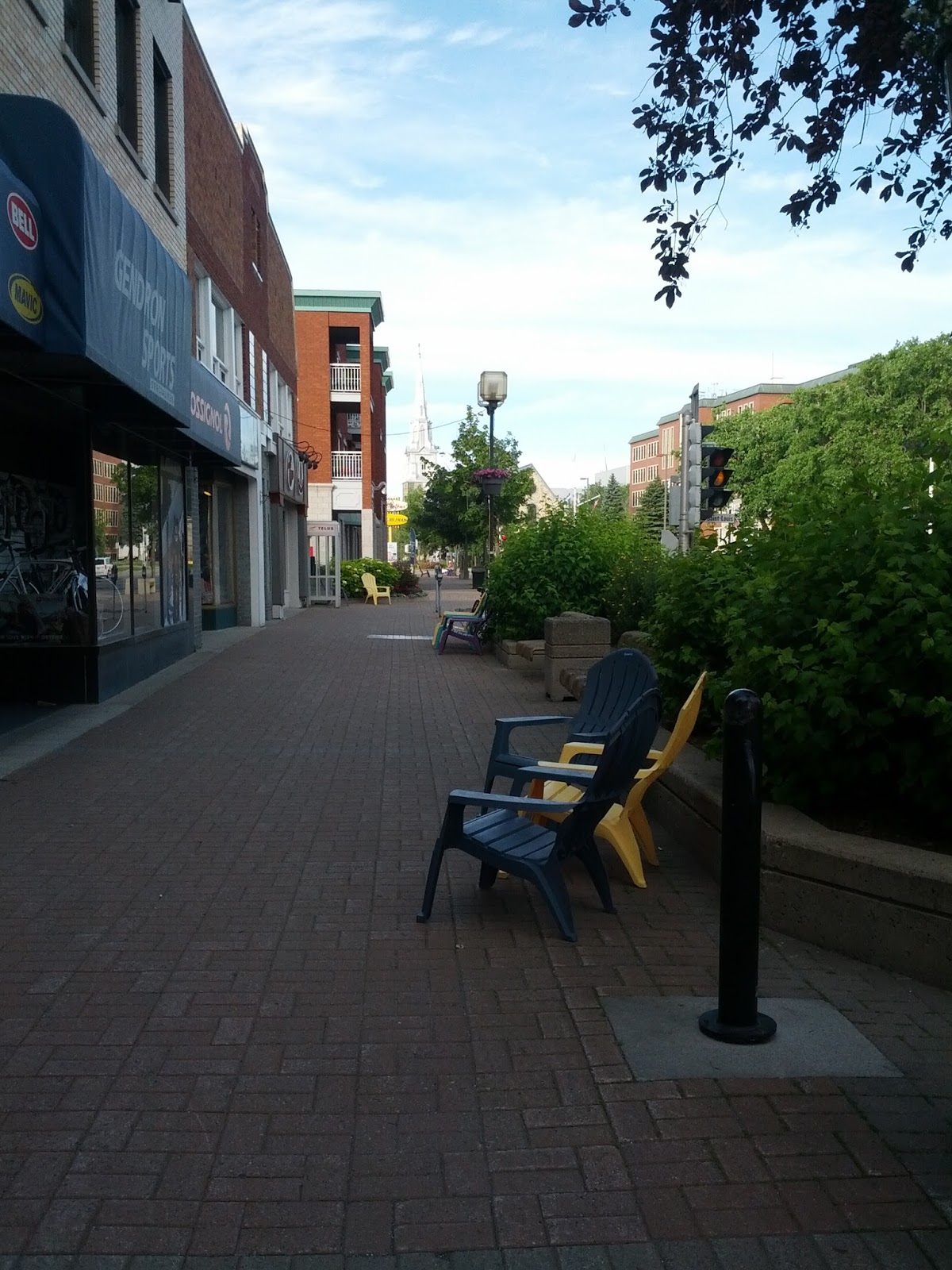 En ville, une petite nouveauté: des chaise de type Adirondack de couleur, un peu partout, comme pour nous dire « vous pouvez flâner ici…et là ».