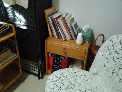 | L’étagère que j’ouvre, à l’occasion, pour vendre quelques petits tricots |