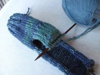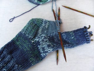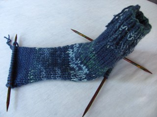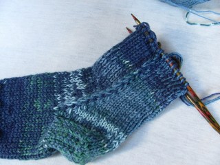 On commence comme un bas normal qui part de la jambe. Une fois les côtes et la jambe faits, on tricote tout le dessus du pied.