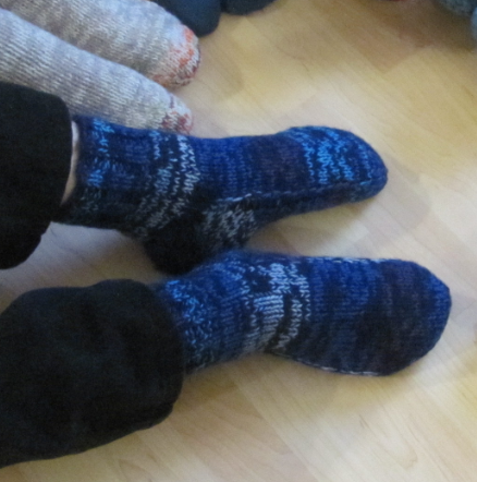 Ils sont beaucoup plus épais que les bas « normaux ». Ils sont tricotés avec l’équivalent d’une laine grosseur no 5 (ou 3 brins de laine à bas)et des 5 mm .