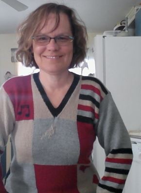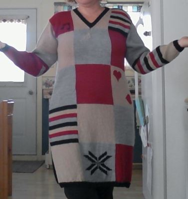 Et ma tunique d’hiver que je viens de terminer. Faite en Lambswool et partner 5 de Phidar (acheté chez Point Mousse, à Place Laurier), et tricoté avec des 3.5 mm. C’est de l’intarsia, donc, tricoté en aller-retour.