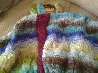 | Avec une laine donnée par Joane Dumont du Festival de la p’tite Laine. Bon, oui, je l’ai « défait » pour obtenir ces petites rayures. |