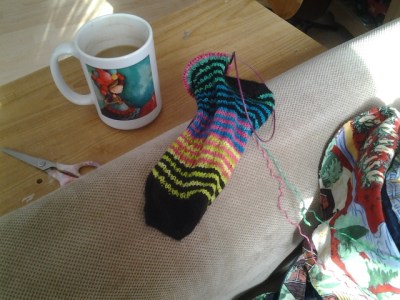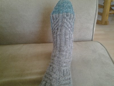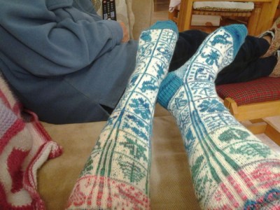 Aussi, je travaille très fort sur mon patron de bas sampler pour ajouter la version de la pointe en montant. Alors ce ne sera pas tout de suite: j’y mets le temps nécessaire. En même temps, j’écrirai un article pour expliquer comment j’ai amélioré l’élasticité de la partie des « cadres » dans ce modèle. Les voici, trrrrèèès longs, terminés, et tricotés de la pointe en montant.