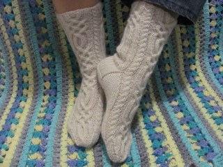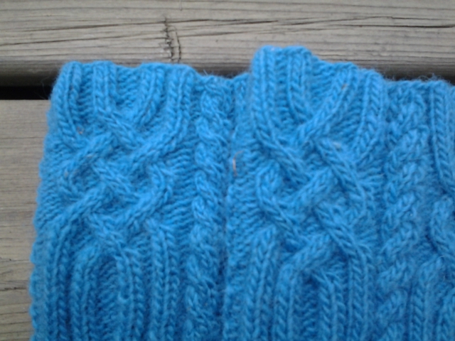 Allons-y avec le tricot. Voici d’abord les bas Trinité. C’est un patron de chaussettes en laine moins fine (grosseur no 2) et aiguilles de 3mm. Les bleus ont été faits en laine Douceur de Kamouraska, une laine dite « du pays ».