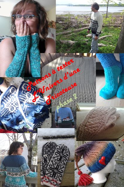 Mais voici un patron à tester qui a été ajouté, mais qui n’est pas sur l’affiche de patrons à tester! (Oui, il faut vraiment aller voir. Hi! Hi!). C’est mon plus récent tricot, et il est plutôt facile!