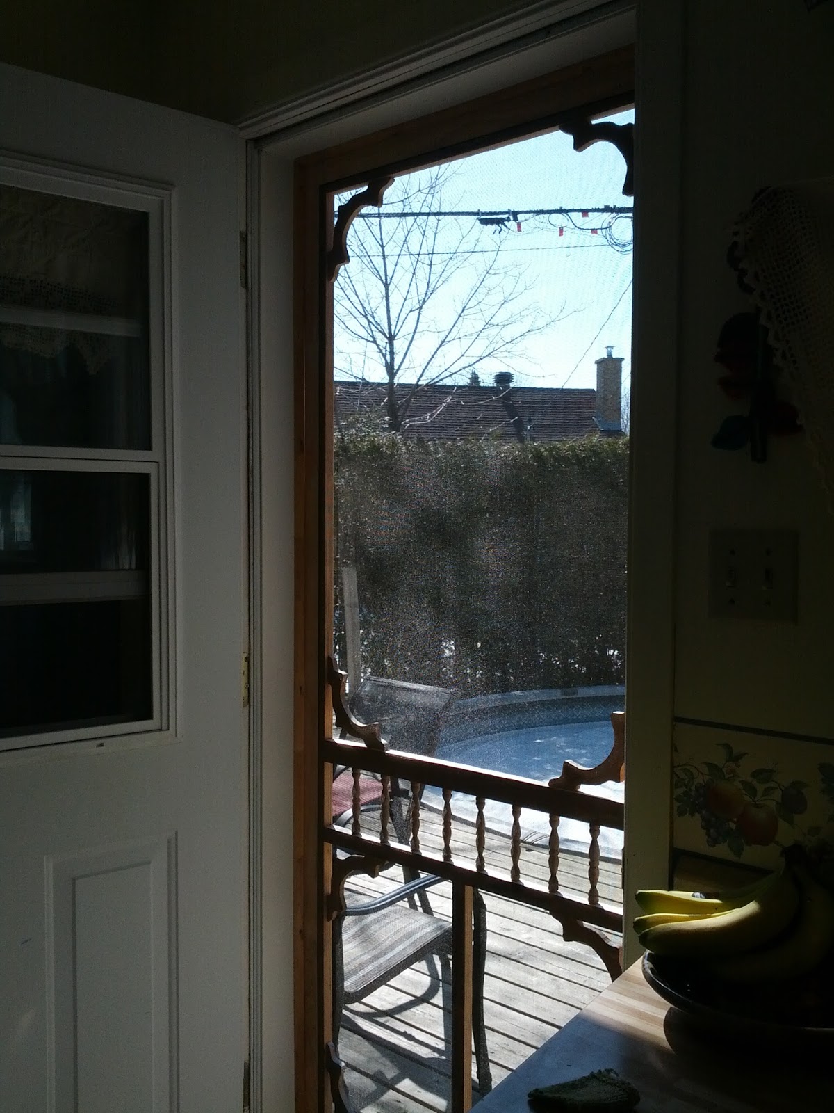 Mais commençons pas le climat. Ci-haut, la porte-moustiquaire est posée et on entrevoit la piscine…pleine de neige et de glace! Ce n’est pas pour demain la baignade. C’est long mais on commence à avoir un printemps au Québec.