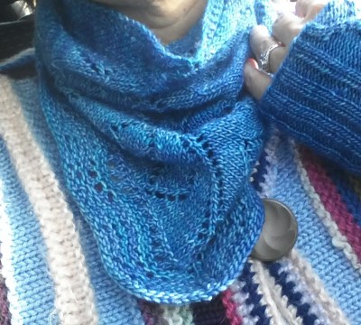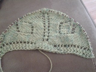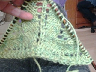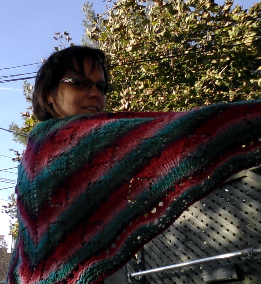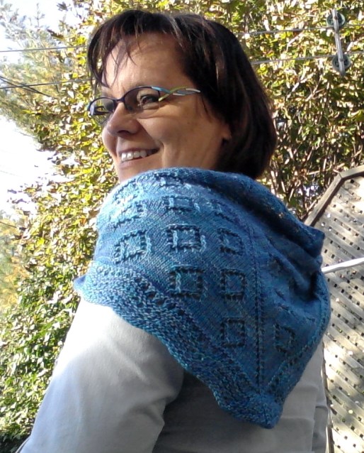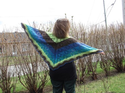 Ce que je veux dire, c’est qu’il y a des étapes à observer, le nombre de mailles augmente continuellement, il y a une bordure, et ce n’est pas un simple rectangle. Mais, le motif est plutôt simple, la bordure se fait, à la suite, normalement (pas perpendiculairement comme c’est souvent le cas, et c’est pas mal plus difficile!), dans un point plus facile même que la grille principale. La laine est moins fine aussi que la plupart des châles de tricot ajouré. Ce sera plus facile pour un premier. Pourtant, l’effet est là: on obtient une fin en « vagues », un beau triangle pour s’envelopper.