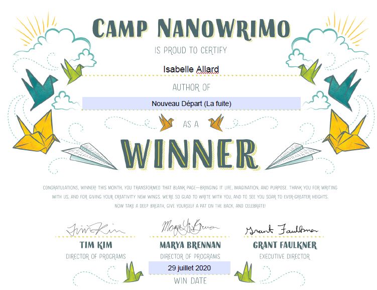 J’ai terminé mon camp NanoWrimo de juillet. Troisième participation, toujours pas de « livres » en vue (j’en ai jasé dans cet article). Mais quelle belle expérience! Et le beau logo de ce camp a joué un rôle dans ma décision d’y participer. Haha!