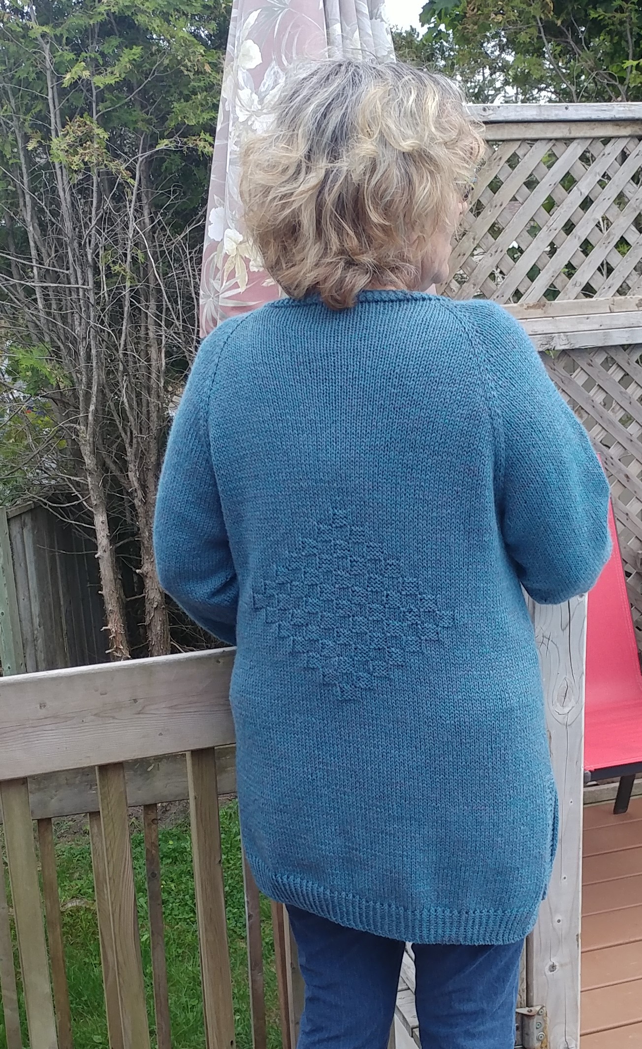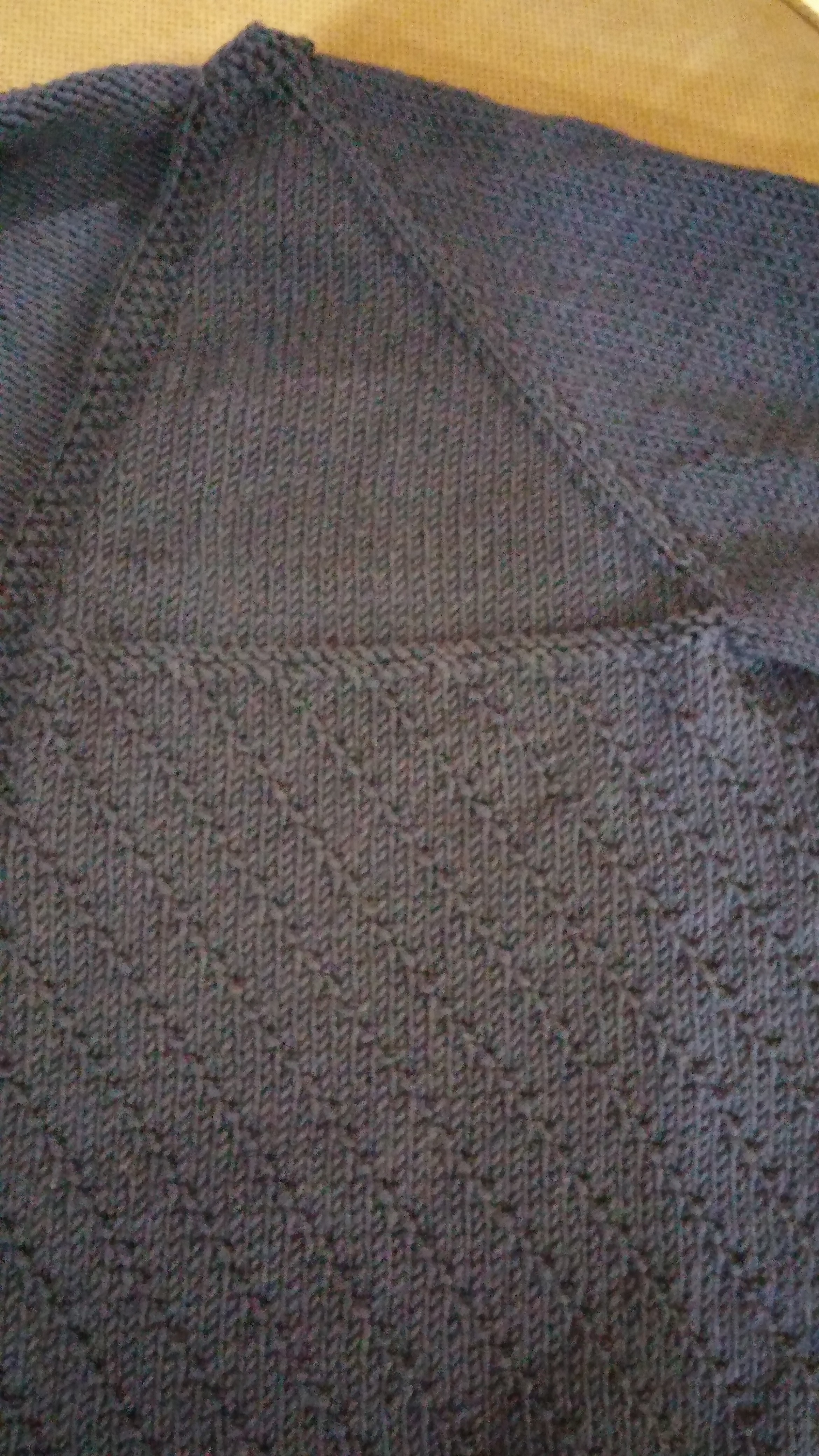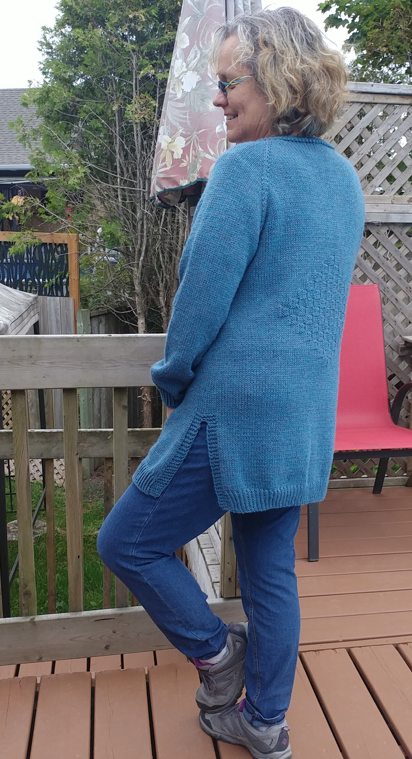Et pour terminer, je l’ai refait en Berroco Vintage dk, achetée chez Point Mousse (dans une couleur qui m’a beaucoup attirée), alors que je commençais à y donner des cours de tricot. Je l’ai fait plus longue, avec des fentes sur les côtés, des poches intégrées et un autre motif dans le dos et sur les devants. Et hop! 3 autres options! Vous savez, j’ai bien de la difficulté à tricoter juste en jersey.