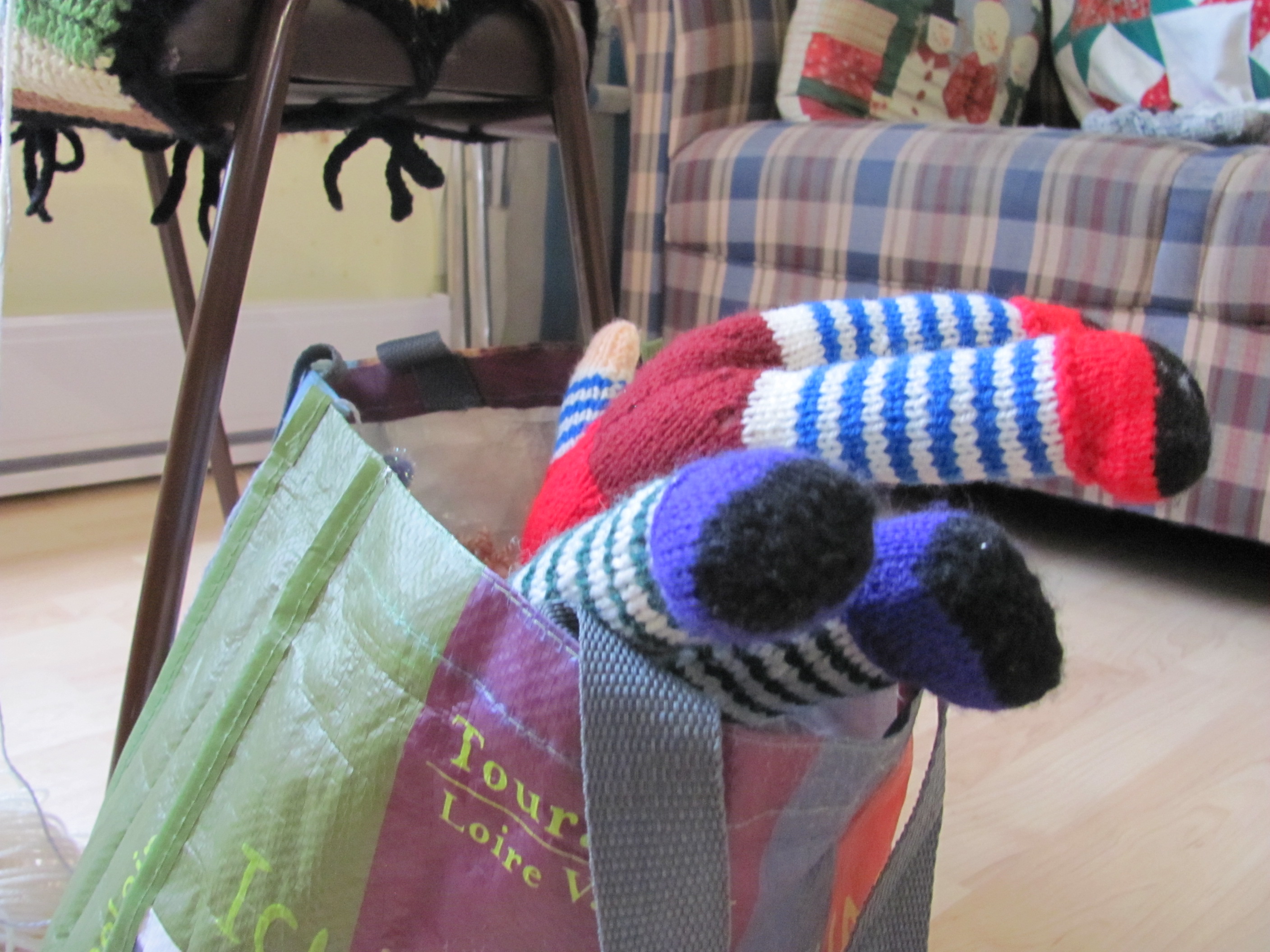 D’ailleurs, j’ai déjà écrit une petite histoire pour mes petits-enfants avec mes lutins de Noel tricotés. Voilà l’histoire en question (et quelques images ici-bas tirées de la dite histoire). Mais là, ça « spin » fort dans ma tête. J’aimerais faire une valise ou un sac à dos à la poupée et lui faire faire un voyage.