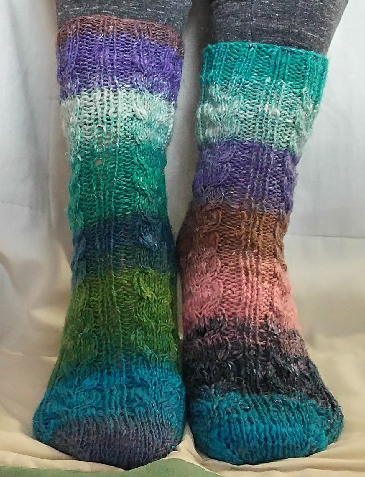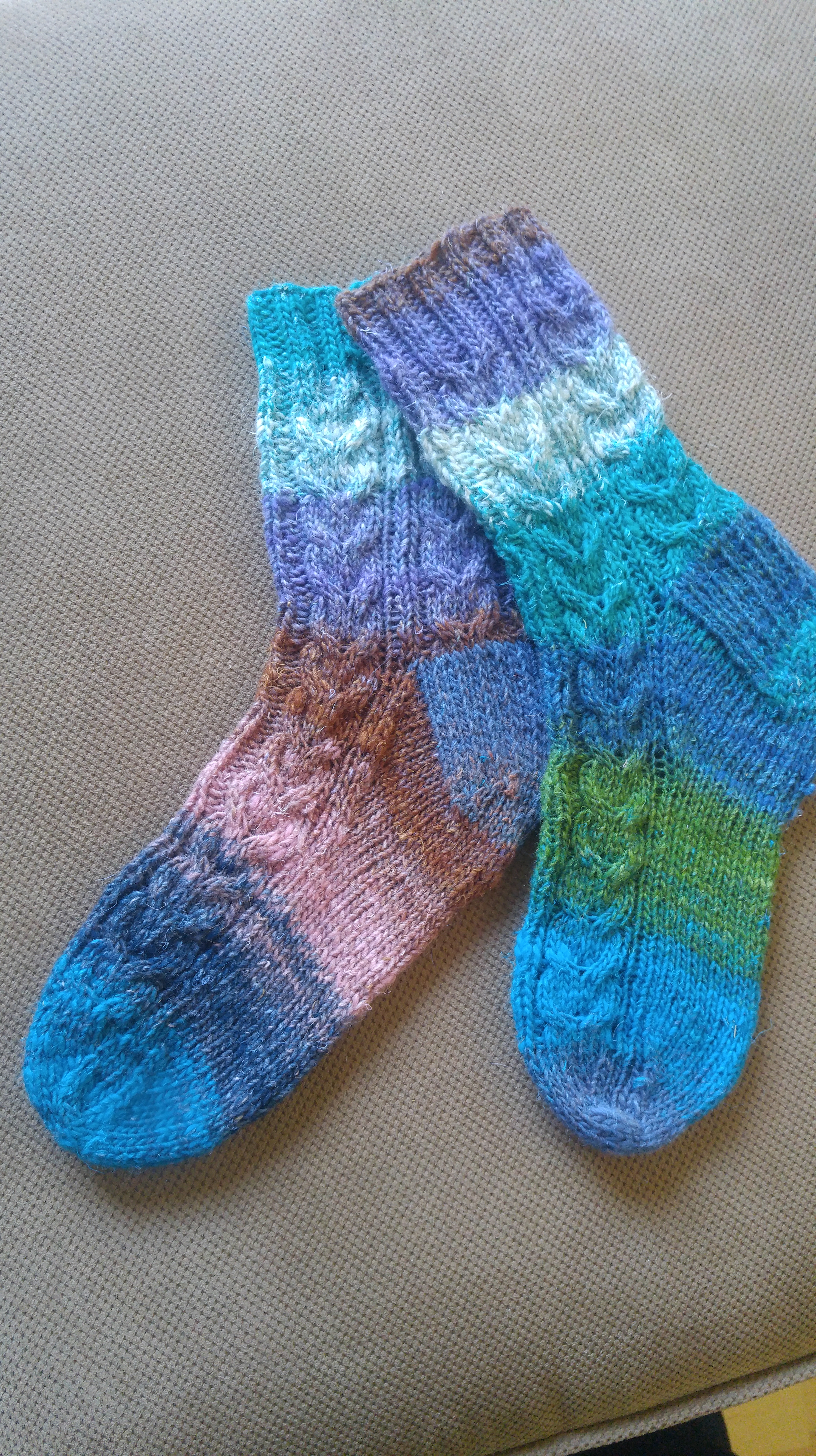 J’ai donc improvisé ce petit patron (une paire dans chacune des laines mentionnées), pour me rendre compte que ce serait plus compliqué pour moi de le faire en plusieurs grandeurs. Donc, la version gratuite, tout de même assez élastique, convient bien pour une dame de pied moyen à moyen-grand, ou homme qui n’a pas des pieds trop costauds. Ils sont expliqués uniquement à partir de la jambe, c’est-à-dire de la façon classique. Et, je ne l’offre qu’en français. Il est fait avec 5 aiguilles double-pointes de 3.5 mm (mais peuvent être exécutés avec une aiguille circulaire de la même grosseur et d’au moins 80 cm/32 », si vous préférez, et connaissez la méthode du magic loop)