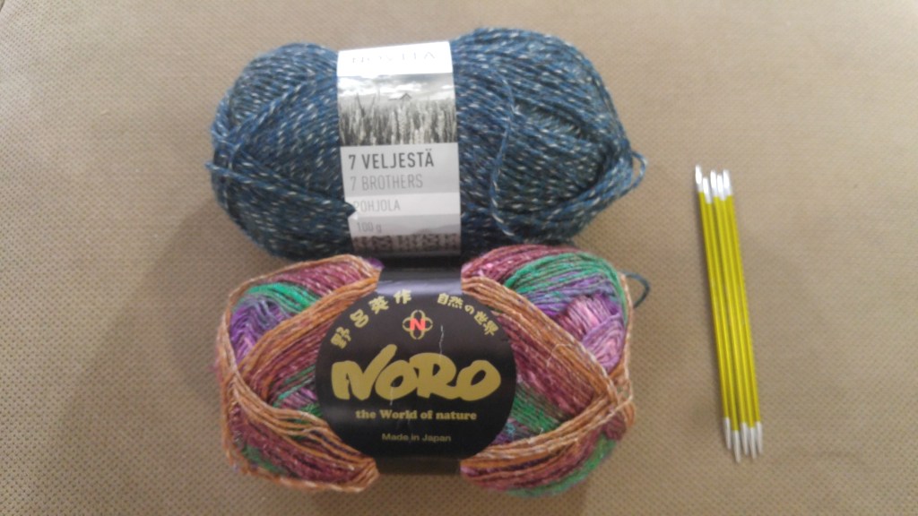 J’avais découvert la laine 7 Veljesta (ou 7 brothers, aussi écrit sur la balle) de Novita, une laine à bas pour tricoter des bas avec des 3.5 mm qui contient 30 % de laine Finlandaise. Un produit rustique que j’ai beaucoup aimé. C’est la laine que j’avais suggérée aux élèves pour le cours. Et moi-même, je m’en suis achetée quelques balles.