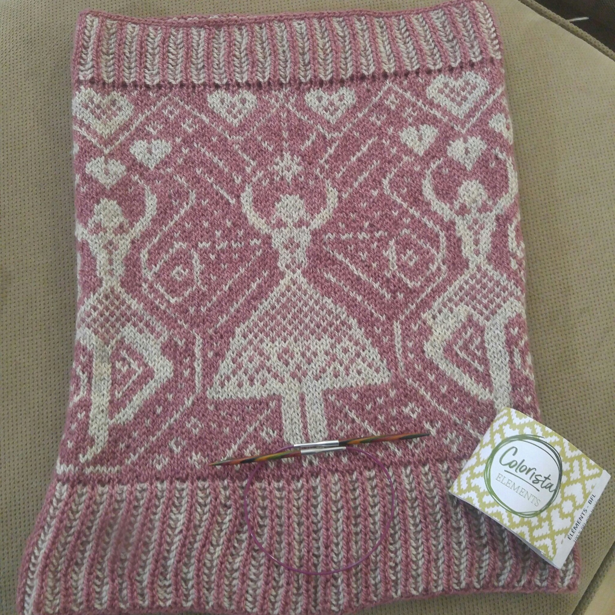 Côté tricot, j’ai terminé mon col danseuse, inspiré de mes mitaines danseuses, mon premier patron de mitaines en jacquard, que je créais il y a 10 ans.. Je l’appelle « Prima Donna », mais il faudra que je vérifie quelques petites choses avant d’officialiser le nom. Je l’aime vraiment beaucoup! J’avais cette laine de colorista depuis plus d’un an et c’est là, que j’ai trouvé quoi faire avec. J’ai aussi terminé mon chandail en Ultra Alpaca de Berroco, que j’avait acheté chez Mont-Tricot il y a…7? 8 ans? Je ne sais plus, mais après la laine utilisée pour la veste « adult surprise jacket » de ce printemps, c’était ma laine qui était ici depuis la plus longue période de temps.
