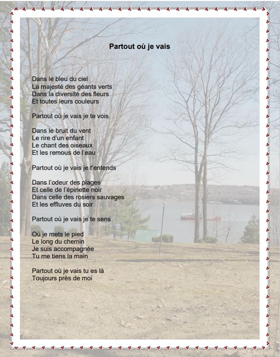 Et, cette fois-ci, j’ai décidé que pour me plonger dans mon projet, j’allais y consacrer une semaine d’écriture, juste écrire des textes et poèmes, tout en faisant un peu de recherche sur le coin. J’AI A-DO-RÉ! C’est pourquoi, le e-book (juste le e-book) comprend 4 petits poèmes écrits lors de ma semaine d’écriture en juillet passé. Je n’ai pas tout gardé (loin de là!) et je ne prétend pas que c’est bon, mais….je vous les offre quand même, sur fond d’une photo prise à l’Île pour chacun.