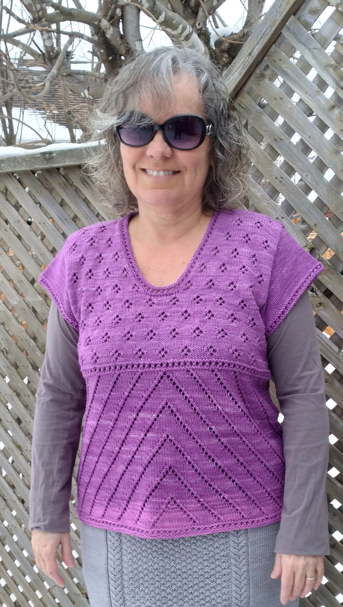 Le haut Pétronille (nom d’un des villages de l’Île), en tricot ajouré et à manches courtes, en plusieurs tailles aussi, mais attention: pas pour débutant en tricot.
