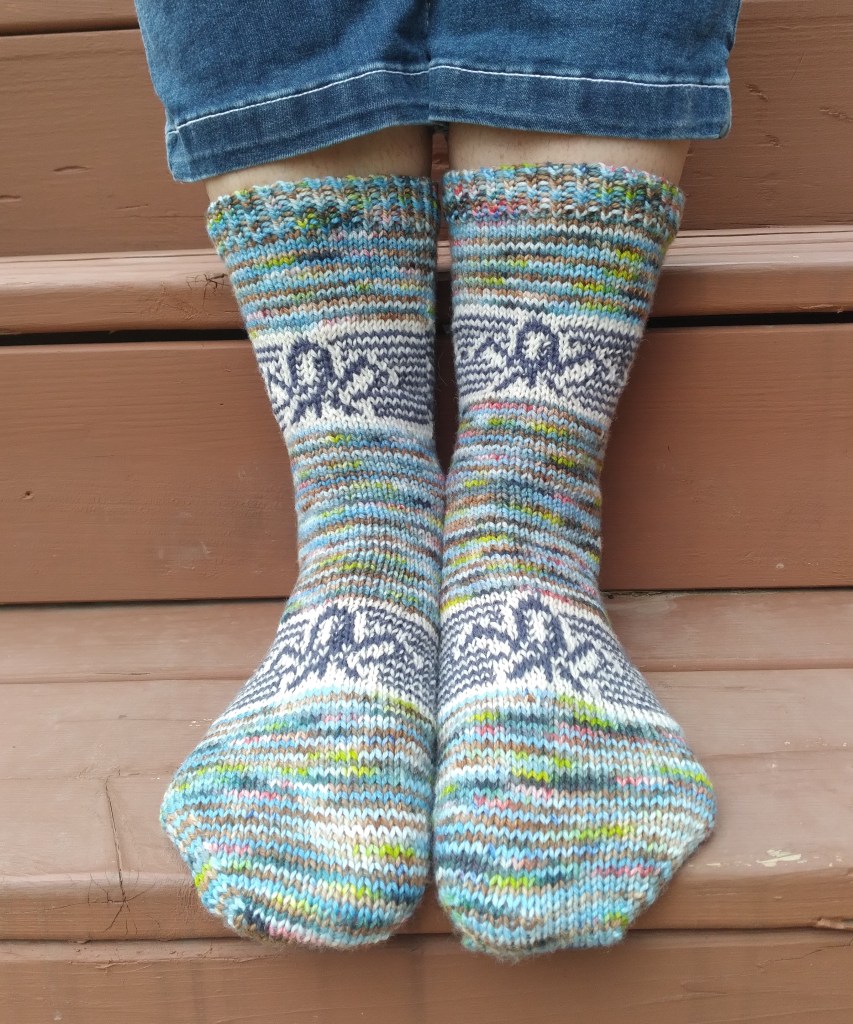 Ils sont obligatoirement tricotés à partir de la pointe parce que le motif ne s’inverse pas. Je viens donc de briser ma règle (depuis 2 ans) de produire, le plus possible, mes patrons de bas expliqués à partir de la pointe autant qu’à partir de la jambe. Pas cette fois-ci, désolée.