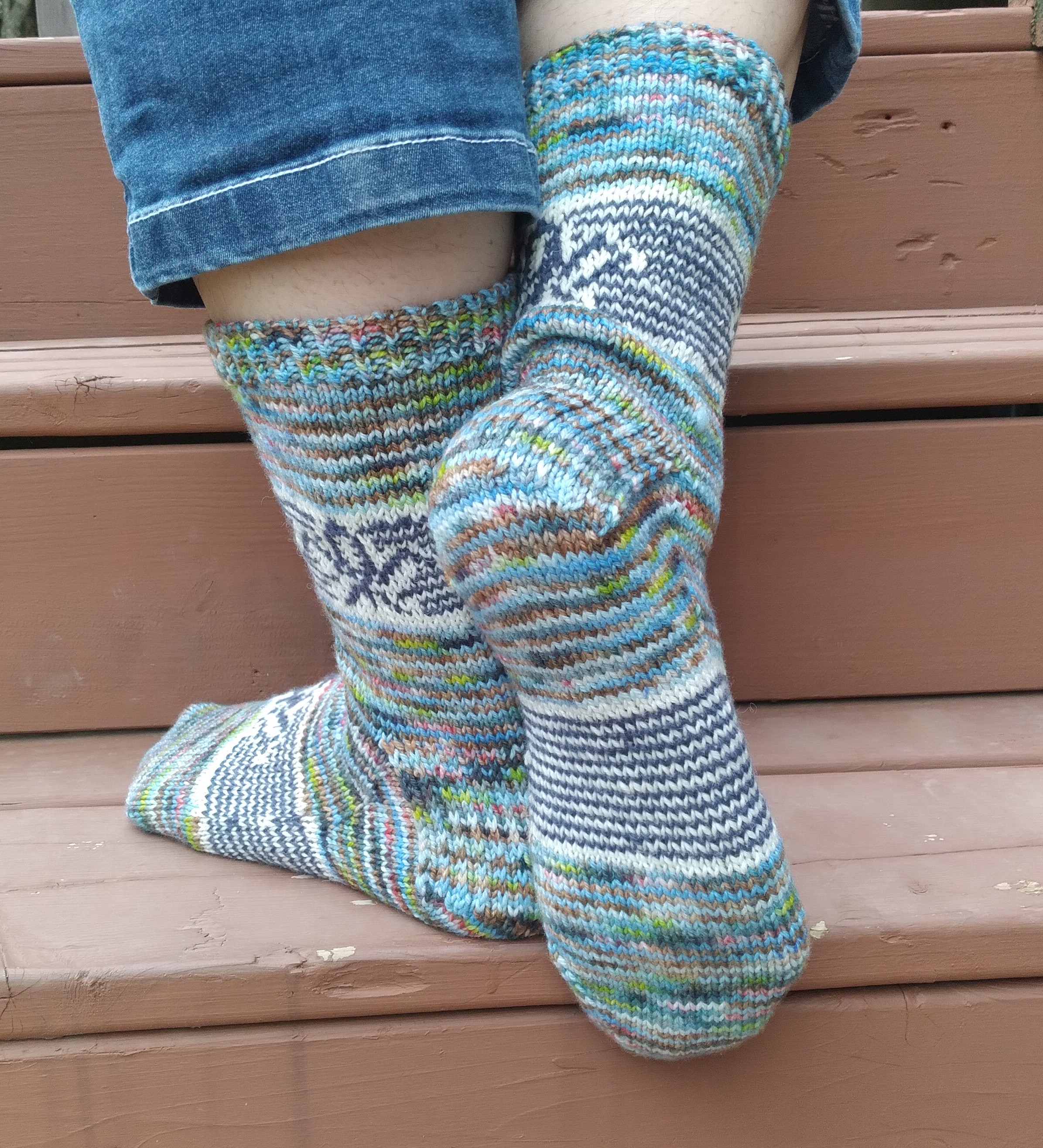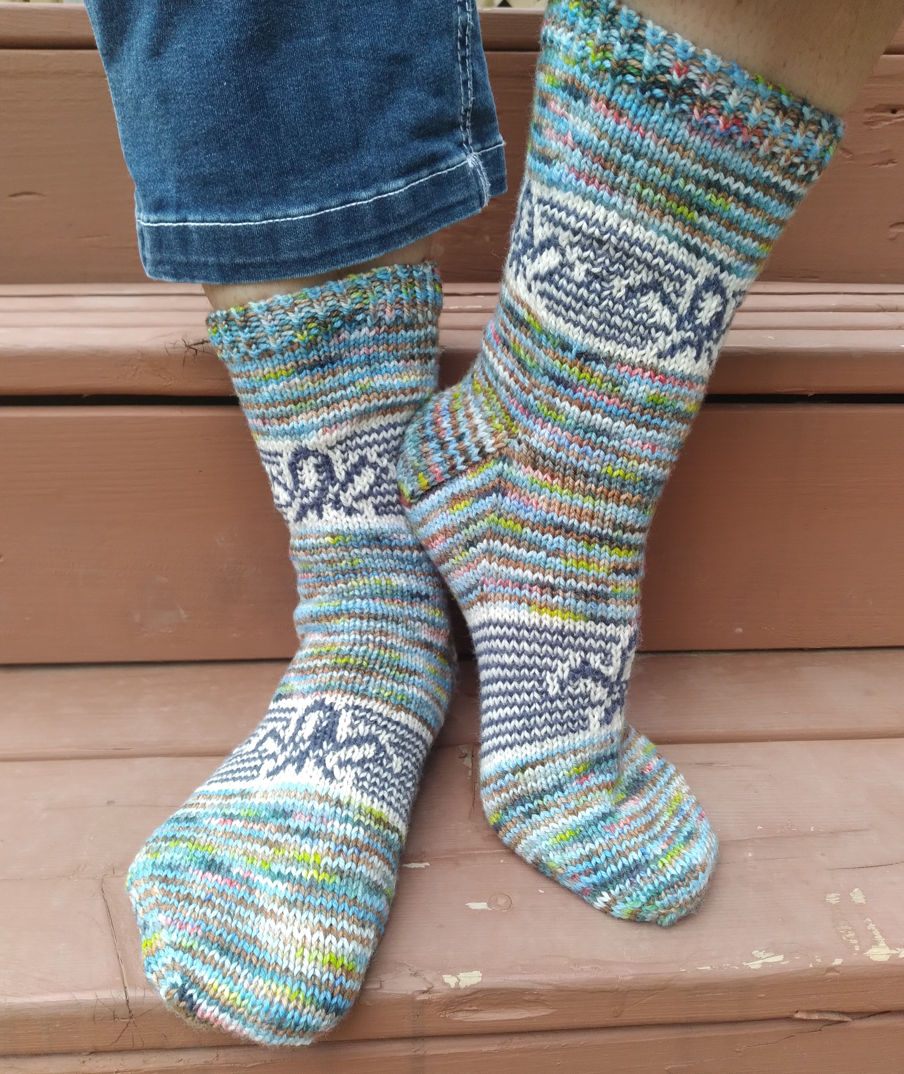 Juin 2021, un nouveau patron de chaussettes, avec un motif de fleur-de-lys, exécuté à l’aide de mailles glissées (du tricot mosaique). Ça tombe bien, la St-Jean-Baptiste, qui est devenue la fête de la province de Québec est le 24 juin. Et le fleur-de-lys est son emblème. Je les ai appelés Mosalys.