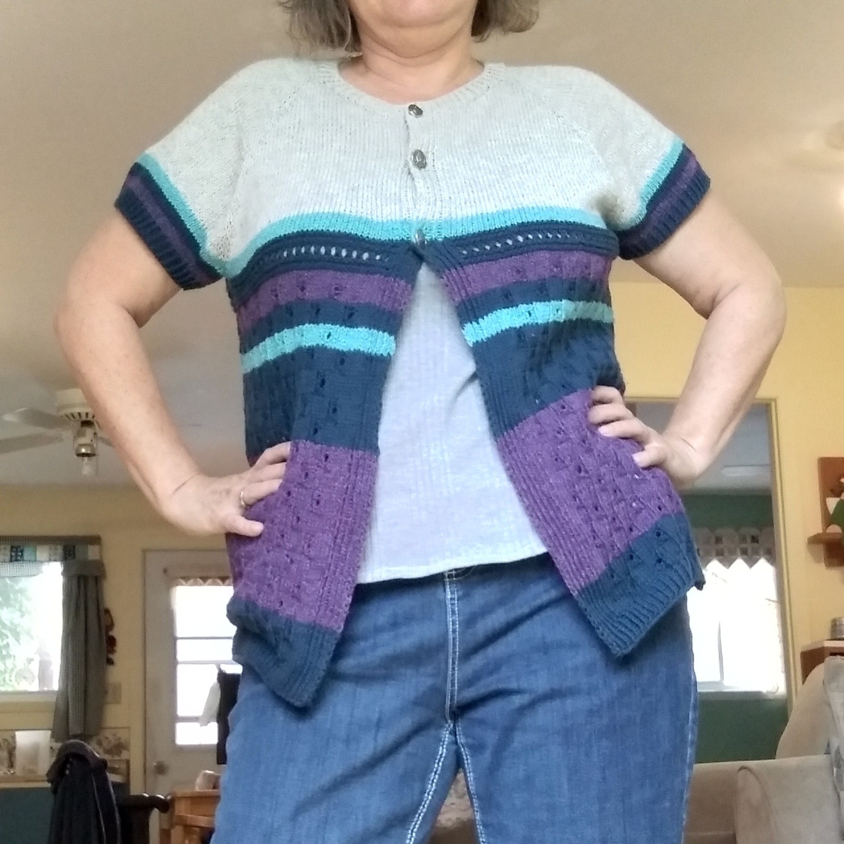 Il faut savoir que cet été, je m’étais donné le défi de faire des hauts à manches courtes. Voilà les autres que celui dont je parle aujourd’hui. L’idée était de passer de la laine, mais aussi, j’ai découvert que ça se portait très bien. Et, ma foi, le fait de ne presque pas faire de manches raccourci de pas mal la longueur d’exécution de ces vêtements.