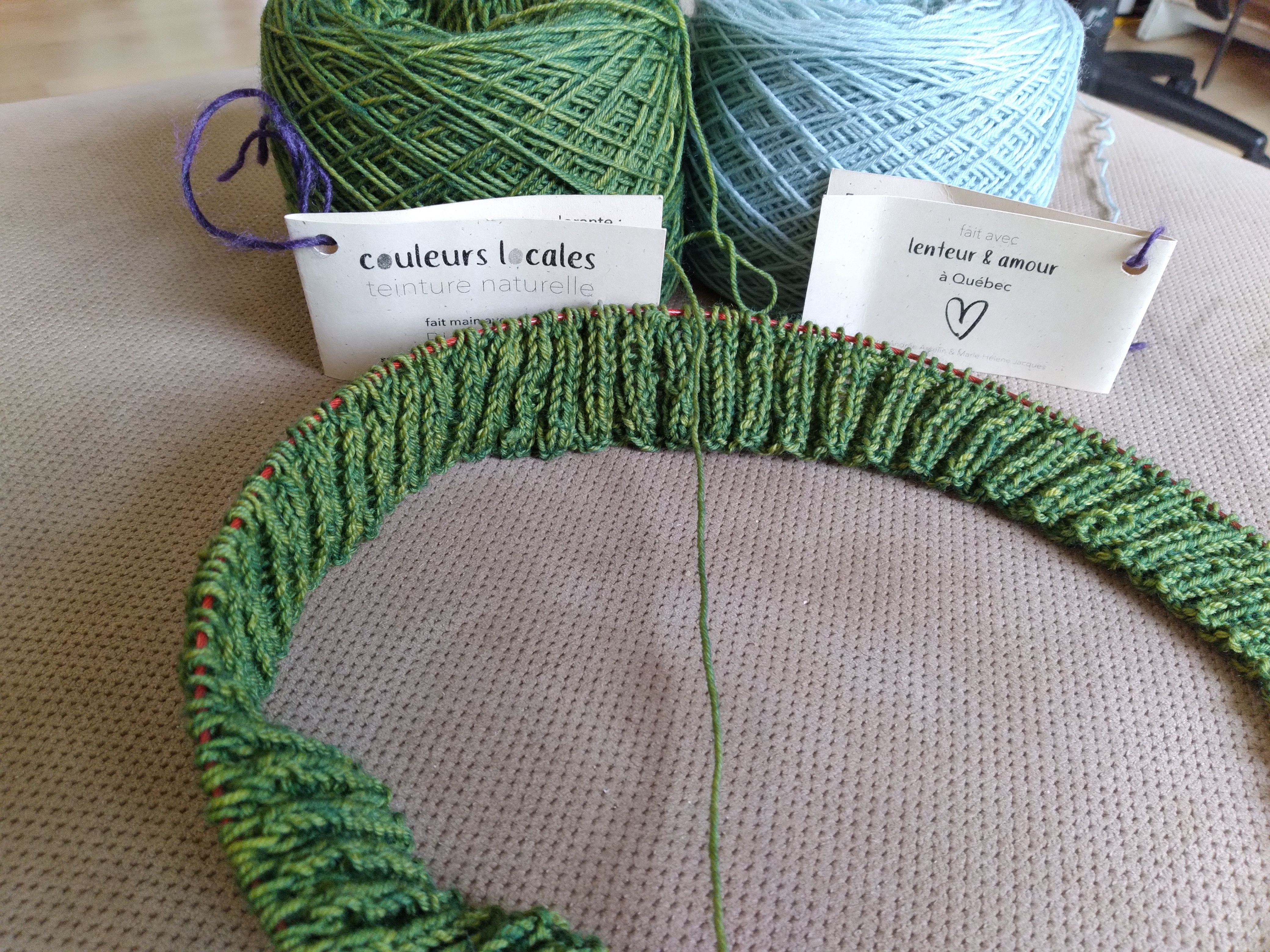 Maintenant, entrons dans le vif du sujet, mon dernier haut, en jacquard et intarsia. J’ai utilisé, pour les 2 couleurs principales, 2 écheveaux achetés lors du dernier festival de la p’tite laine, celui de 2019, à l’entreprise Couleurs locales. Ce sont donc des teintures naturelles. Et, s’y est greffé plusieurs petites quantités d’autres laines (Péché Mignon, Colorista, Emilia et Philomen et Sweet paprika, pour nommer celles dont je me souviens).
