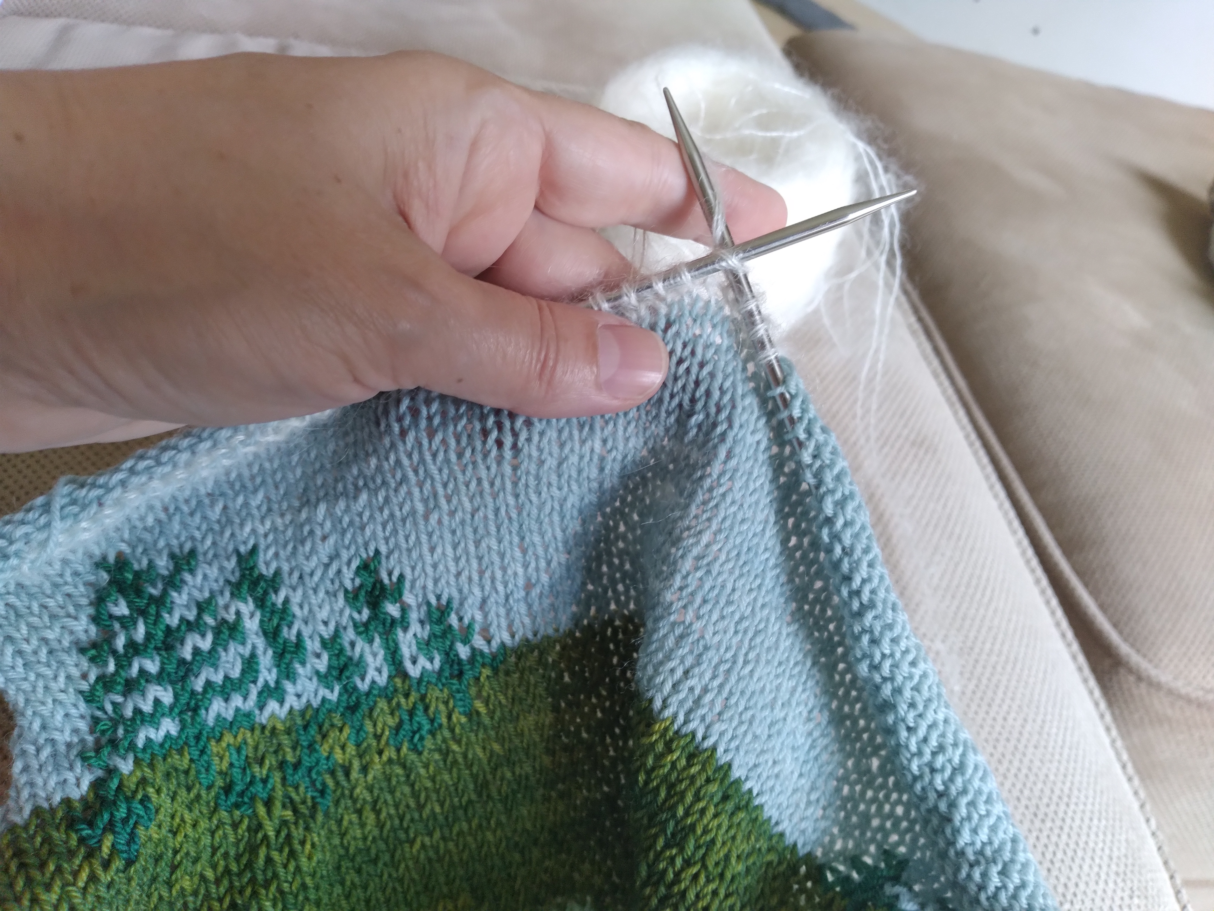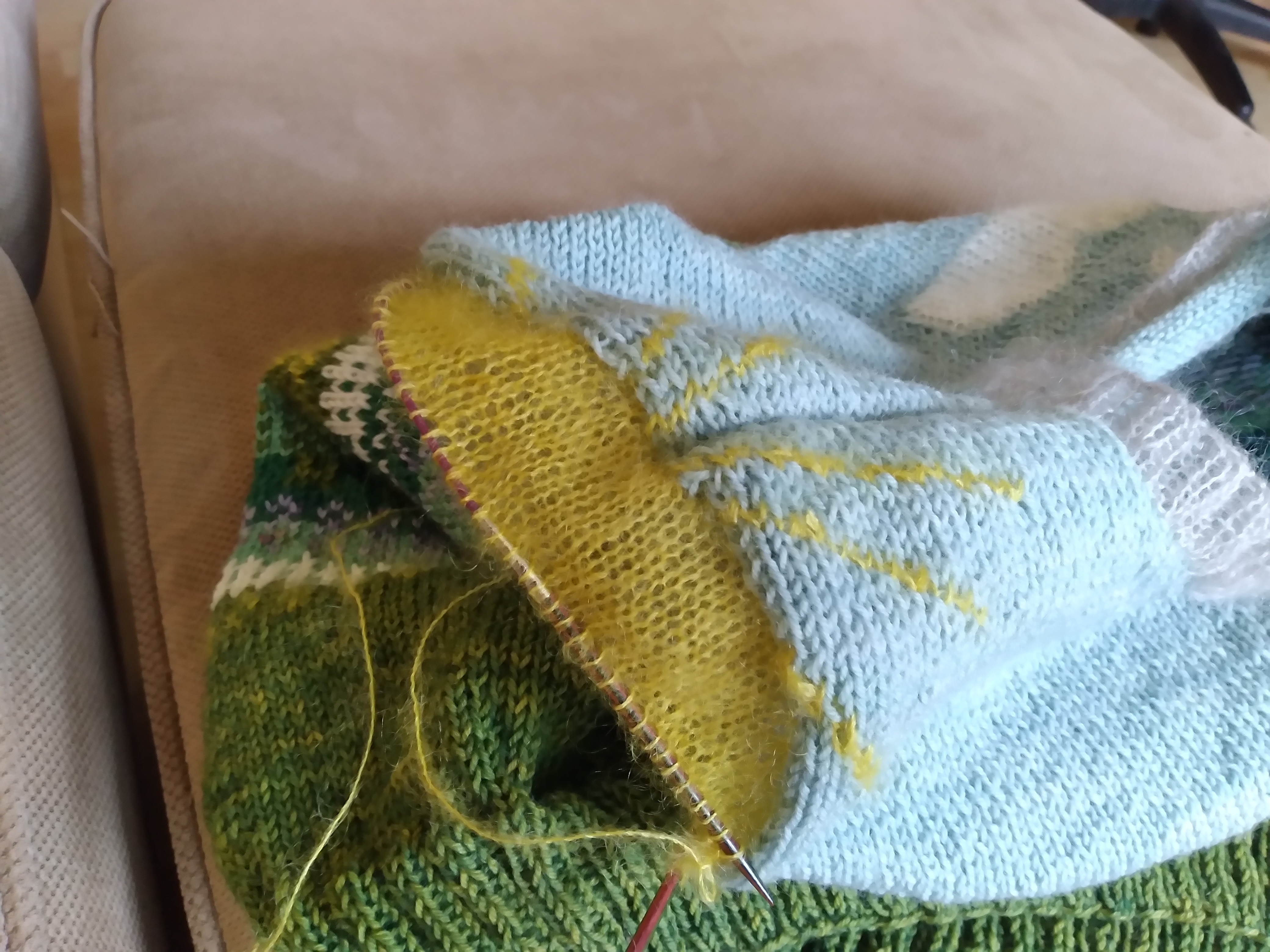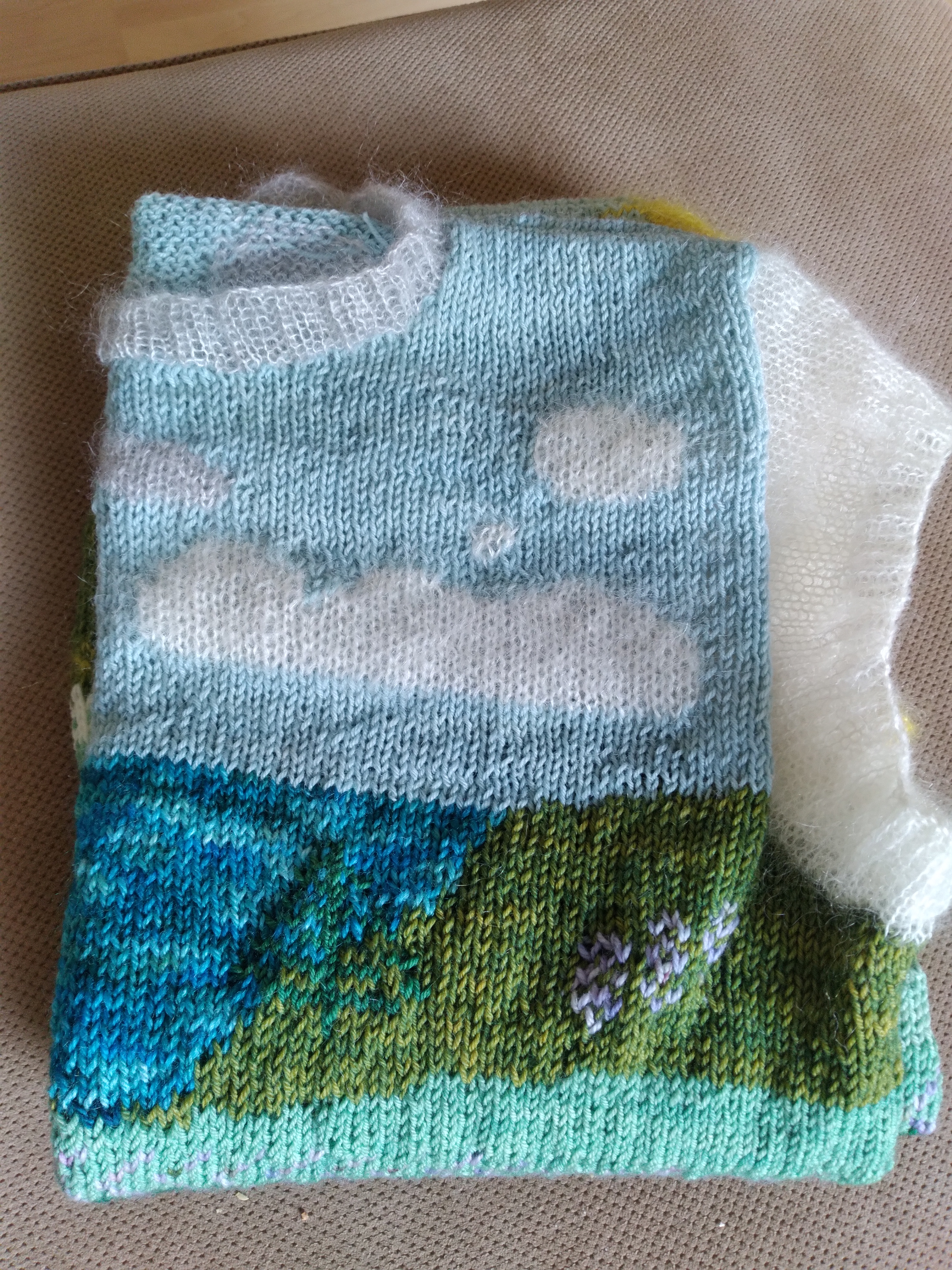 La petite section de côté, qui a été séparée pour l’intarsia, a été jointe ainsi que les épaules. Les manches et le col sont tout en mohair. Une manche pour les nuages blancs, l’autre pour le soleil et le col pour un nuage gris. Donc pas spécialement de travail de couleur pour les manches.