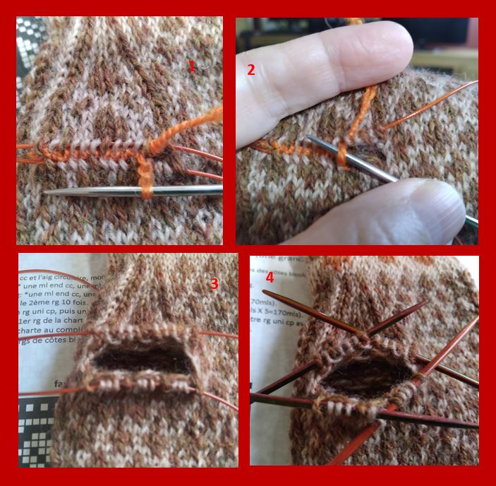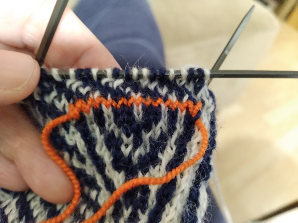 1-Quand on arrive aux mailles à mettre en attente, on prépare une laine perdue (ici la orangé), et on laisse le bout devant la mitaine.