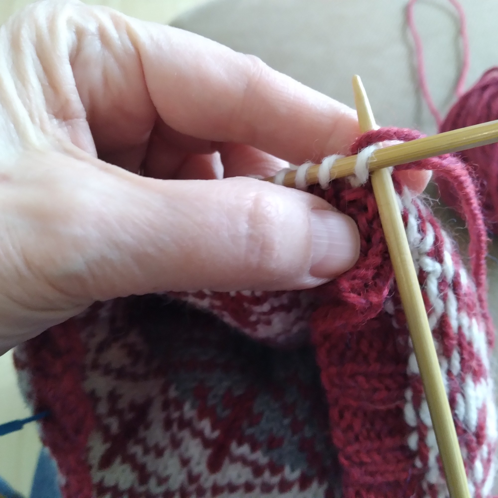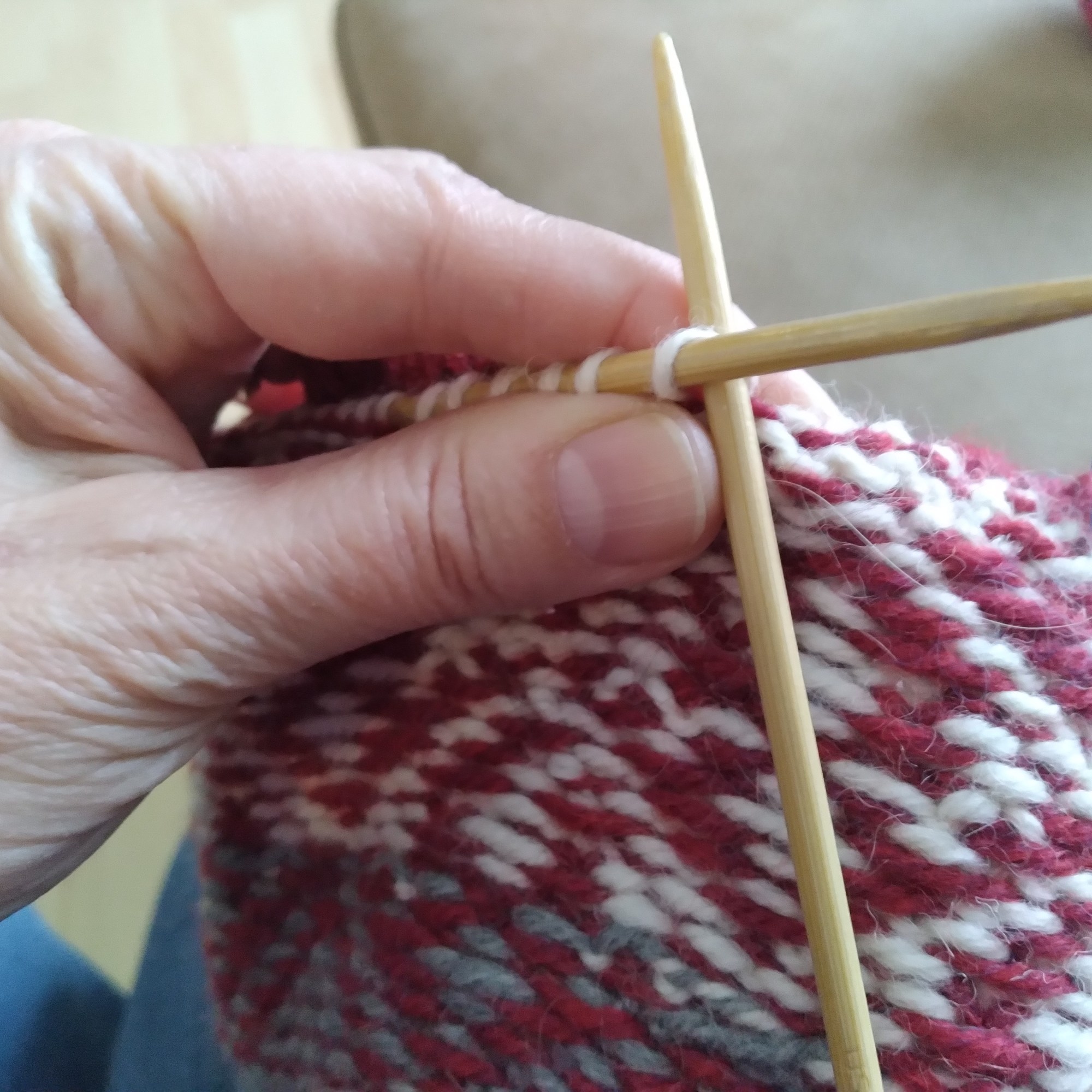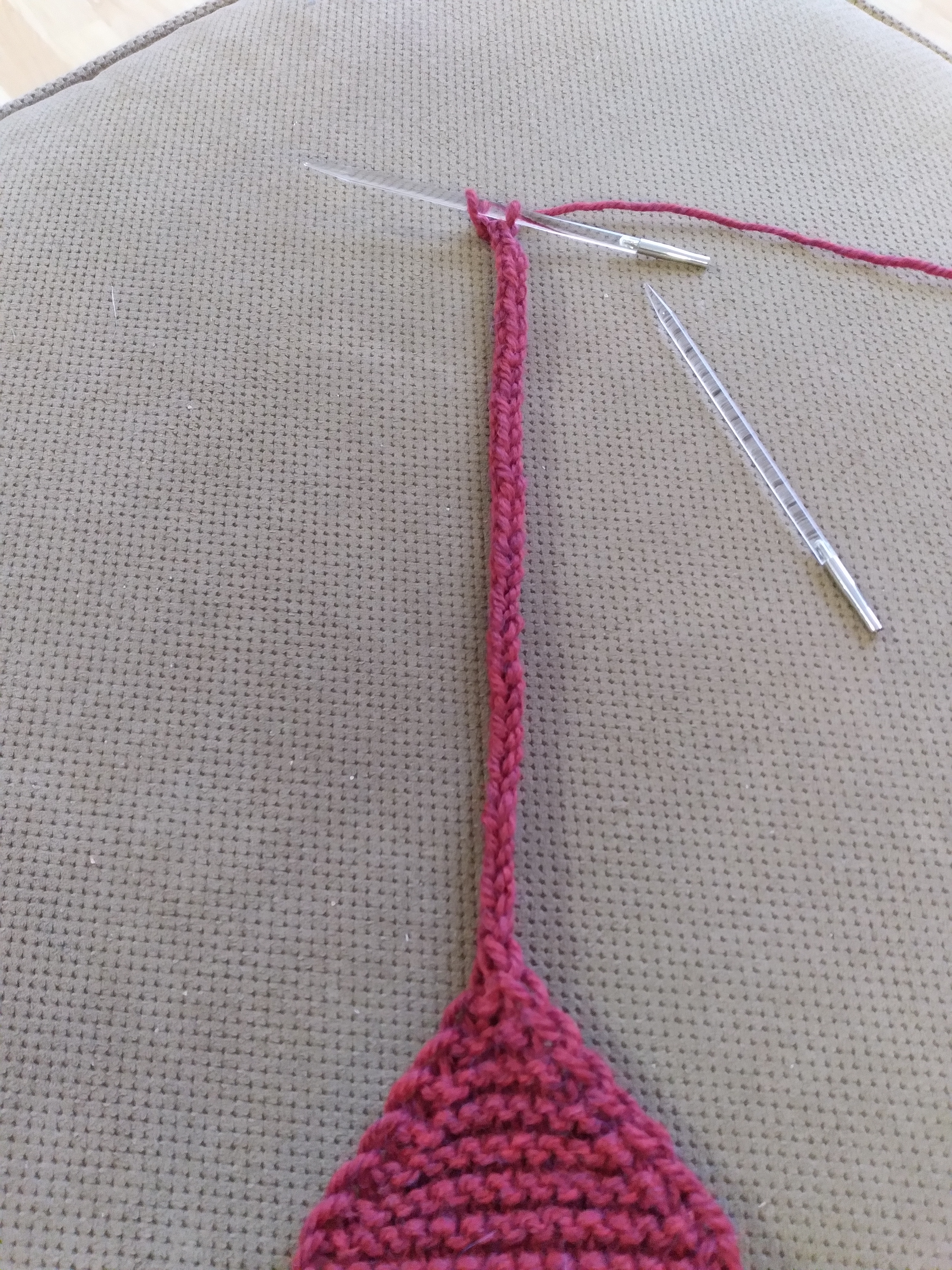 Qu’est-ce qu’une corde en « i »? On le voit sur ce vidéo. Un petit cordon fait avec 2, 3 ou 4 mailles. On doit la faire (la corde en « i ») avec 2 aiguilles double-pointes. 1-On tricote endroit nos 2 mailles (ou 3 ou 4 selon le patron). 2-On ne tourne pas notre tricot pour continuer. 3-On change notre aiguille de main (de la droite vers la gauche). 4-On pousse nos mailles vers la droite, prêtes à être tricotées à nouveau. On reprend à 1, jusqu’à la longueur souhaitée. N.B. J’utilise les bouts de mes aiguilles circulaires interchangeables pour faire ceci.