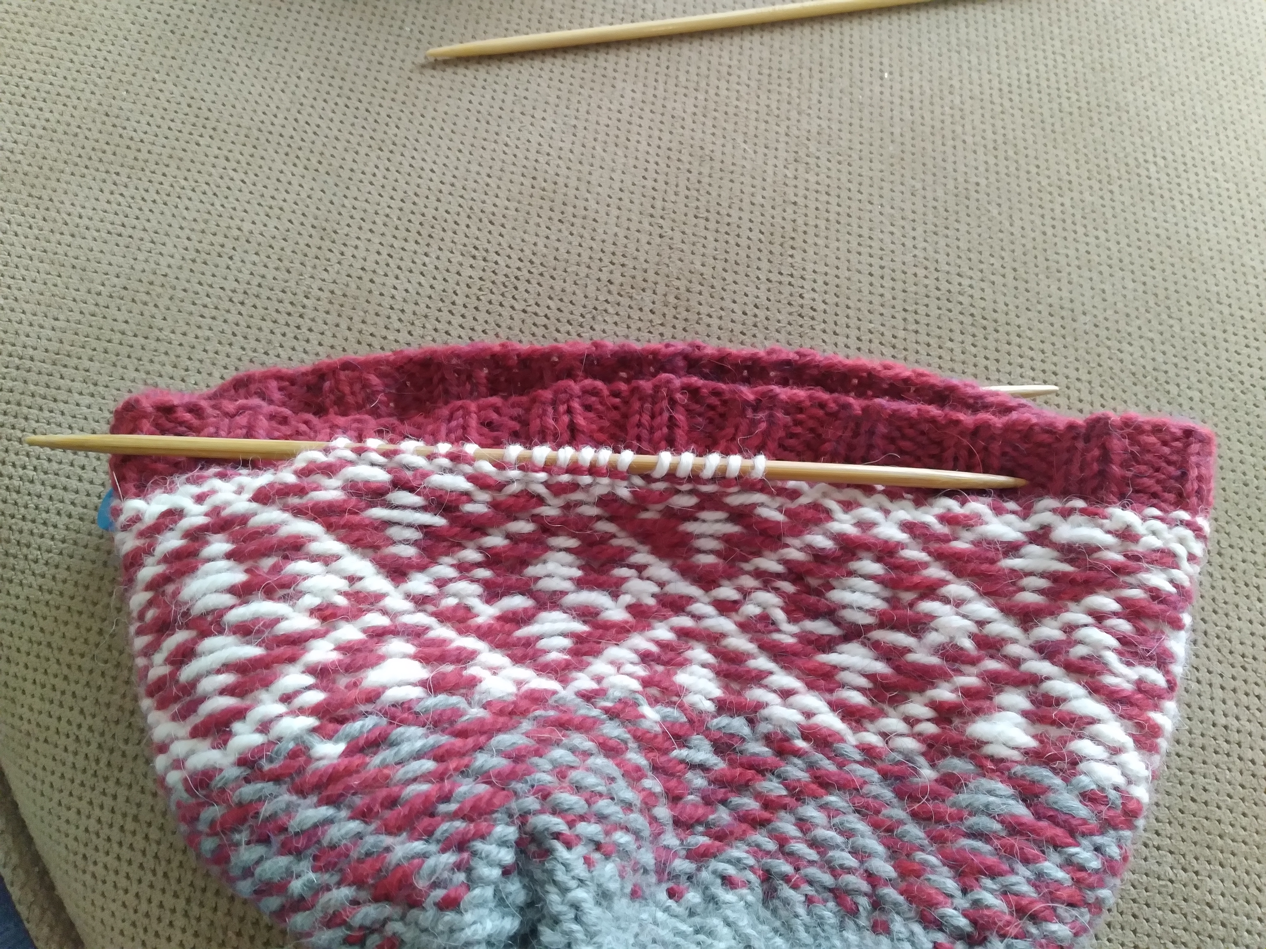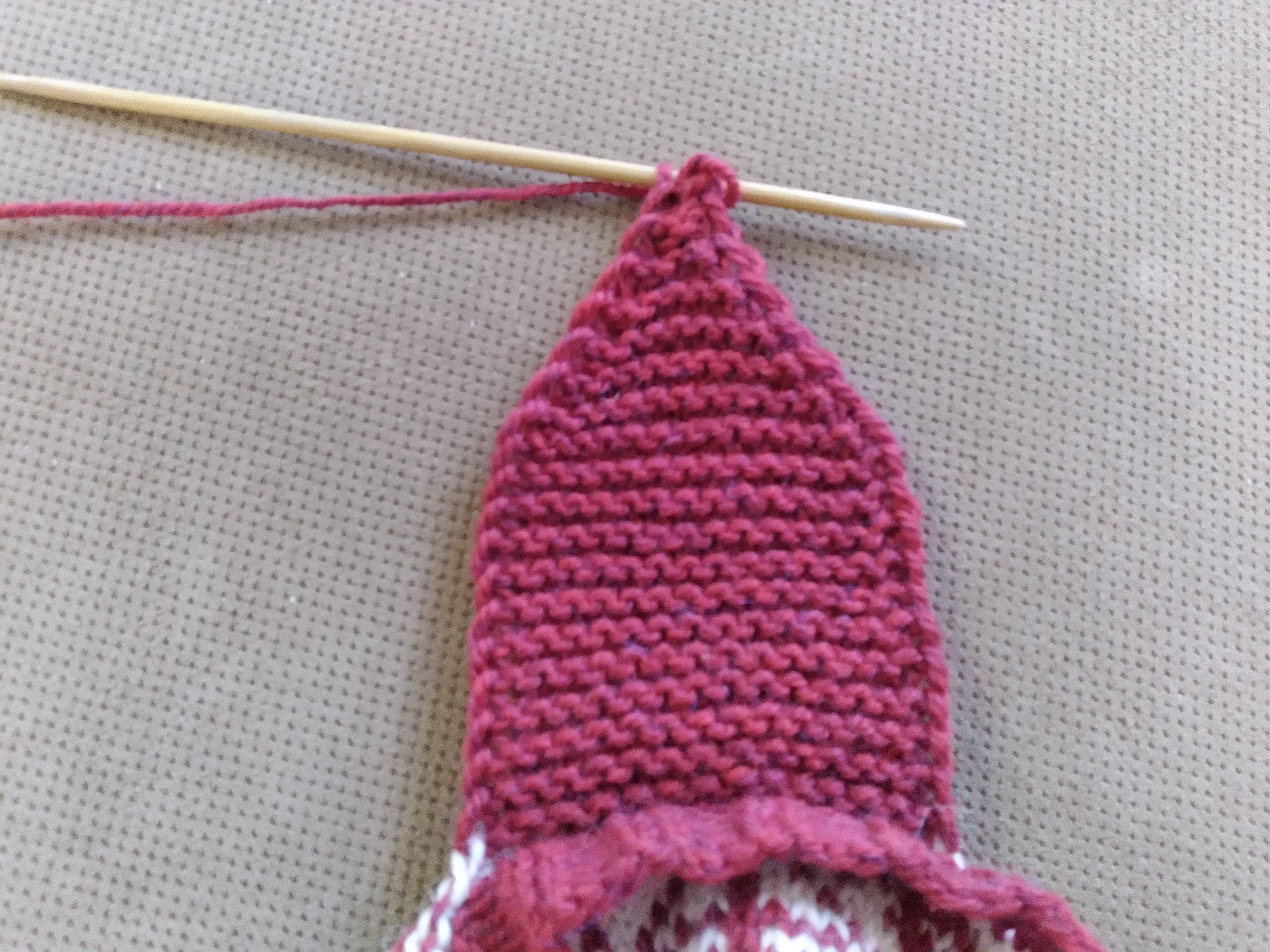 Faites toujours ces 2 rangs, puis aux diminutions, le nombre de mailles envers sur le rang 2 serait de 8, puis de 6, puis de 4…