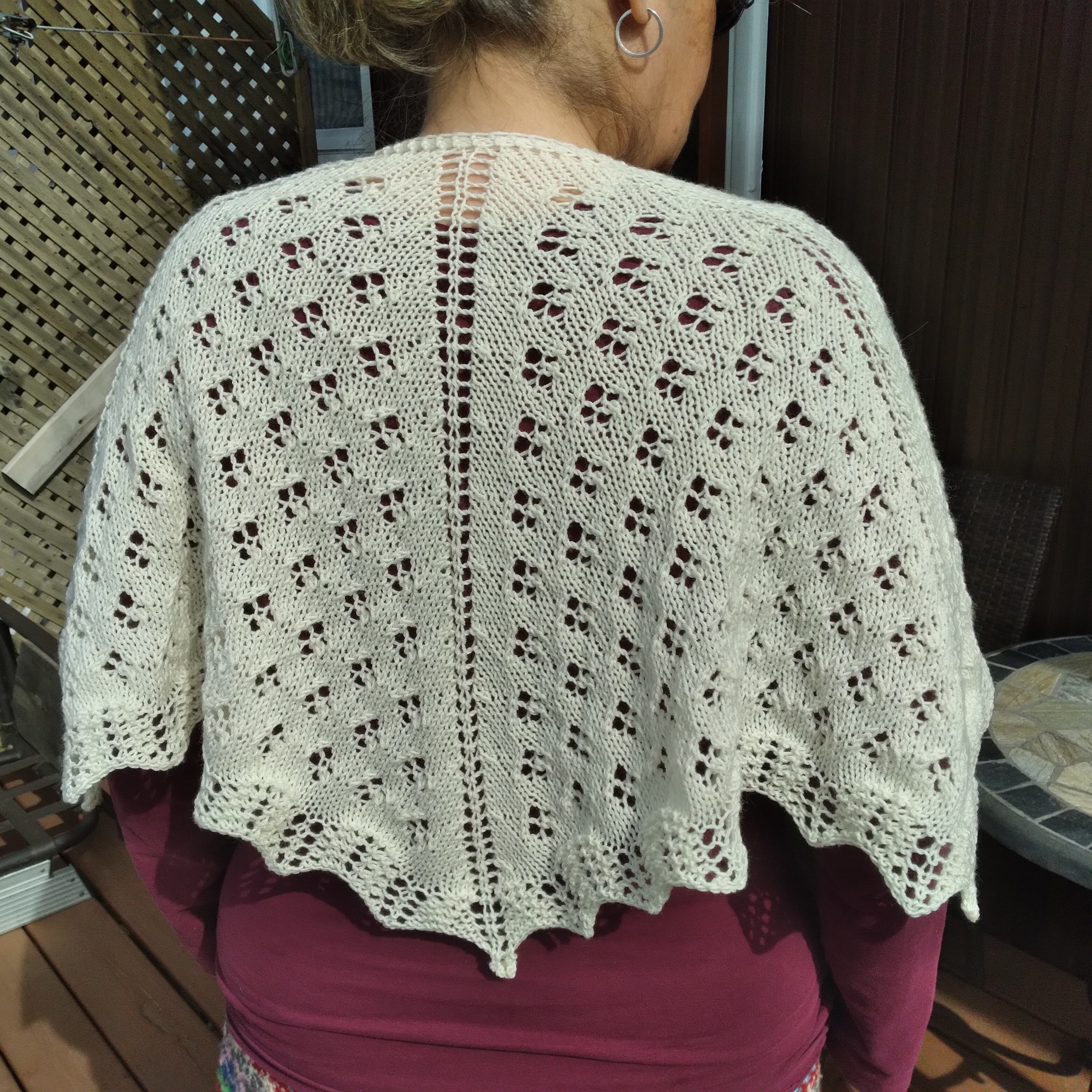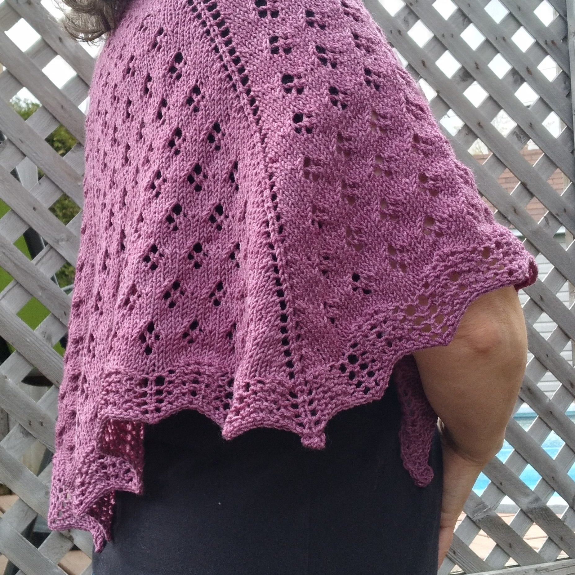 Tricoté avec de laine de grosseur no 1 et une aiguille (circulaire c’est mieux) de 4.5 mmm tout ça contribue à le rendre extrêmement souple et aéré. Une bonne compréhension des grilles est toutefois nécessaire pour faire ce patron.