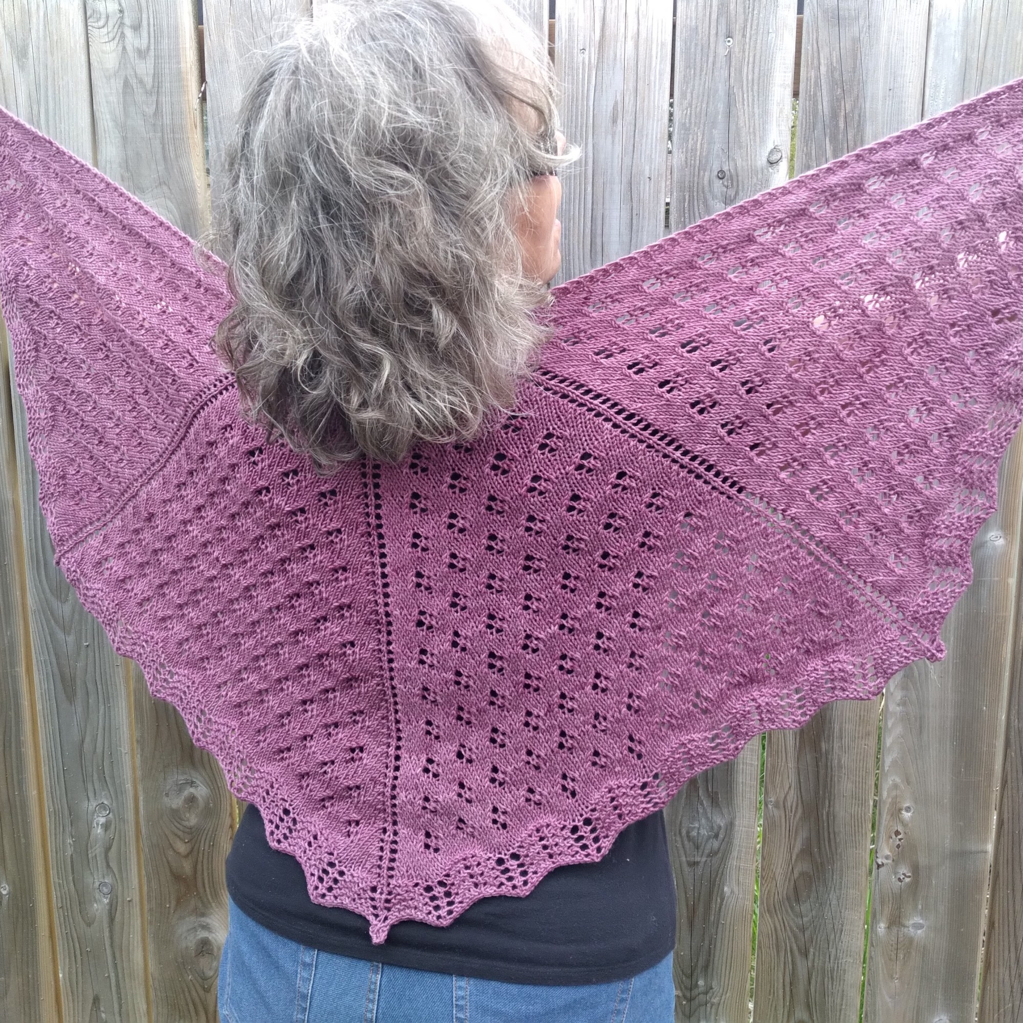 Allons-y un patron à la fois. Commençons par le châle. Il est expliqué pour 1 ou 2 écheveaux (mais vous pouvez le faire plus grand encore si vous voulez). Il repose très bien sur les épaules à cause de sa forme qui dépasse le triangle. Le nom, Oxalyde, est une petite fleur à 4 pétales (comme le petit motif principal) qui pousse de façon sauvage au Québec. Il y a une finition « vaguée » qui peut être accentuée par le blocage, mais surtout par une « fermeture-accent ».