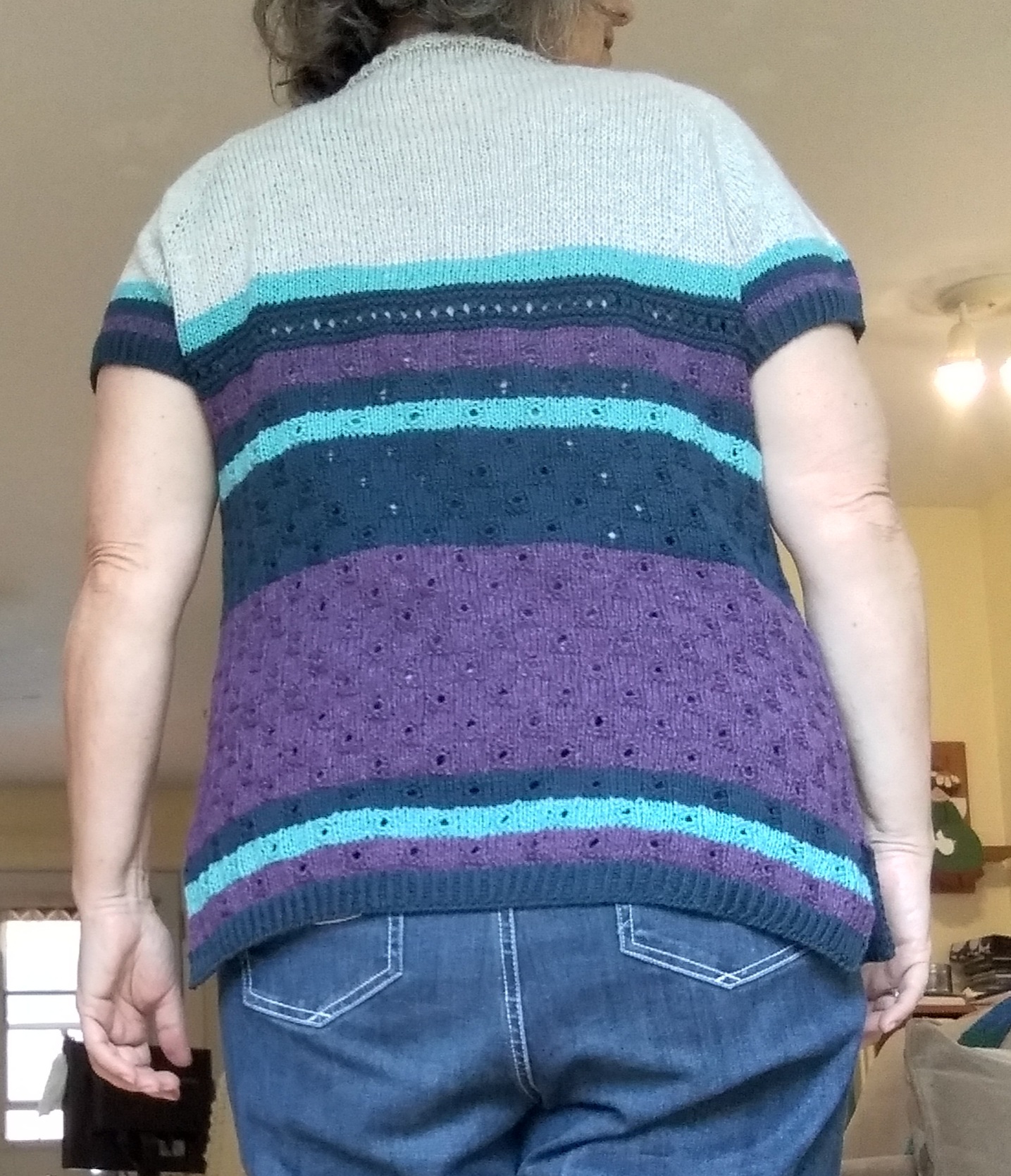 Sachez qu’il est plutôt facile. Je le qualifirais d’intermédiaire, même pas intermédiaire-avancé. La plus grosse difficulté est dans les rangs raccourcis (si vous n’en avez jamais fait). Sinon, pas de coutures, le point est simple, il est droit, avec finition avec séparations dans le bas (pour avoir de petites fentes de chaque côté), et je pense l’avoir bien expliqué en détail.
