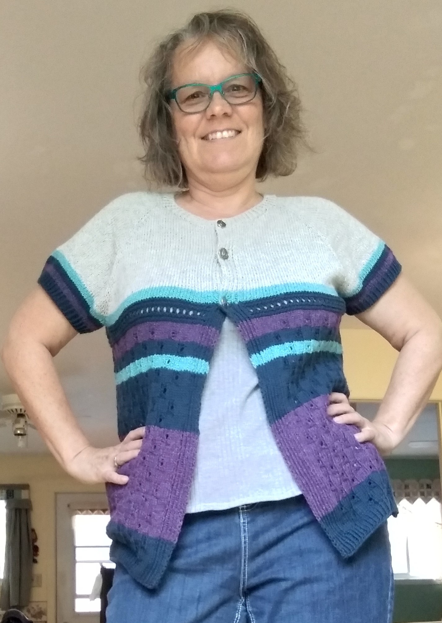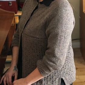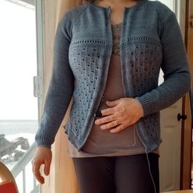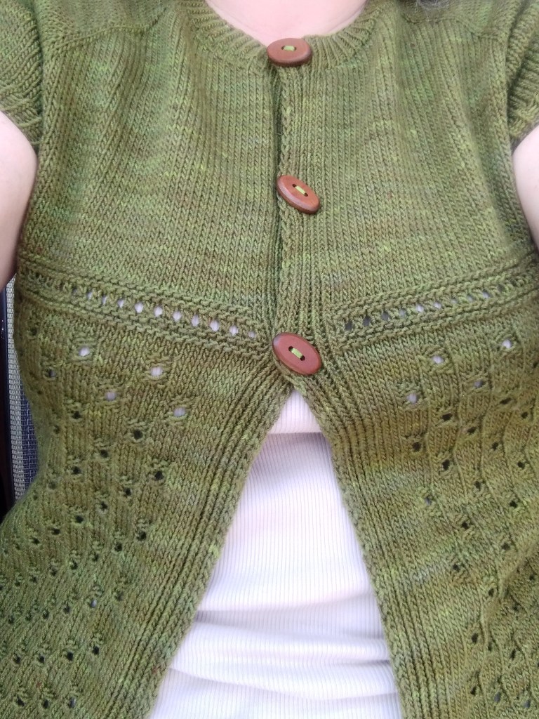 Il s’appelle La Nomade. C’est une veste d’été à manches courtes boutonnée dans le haut seulement (par 3 boutons), et tricotée en laine fine (grosseur no 1).