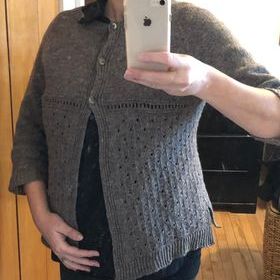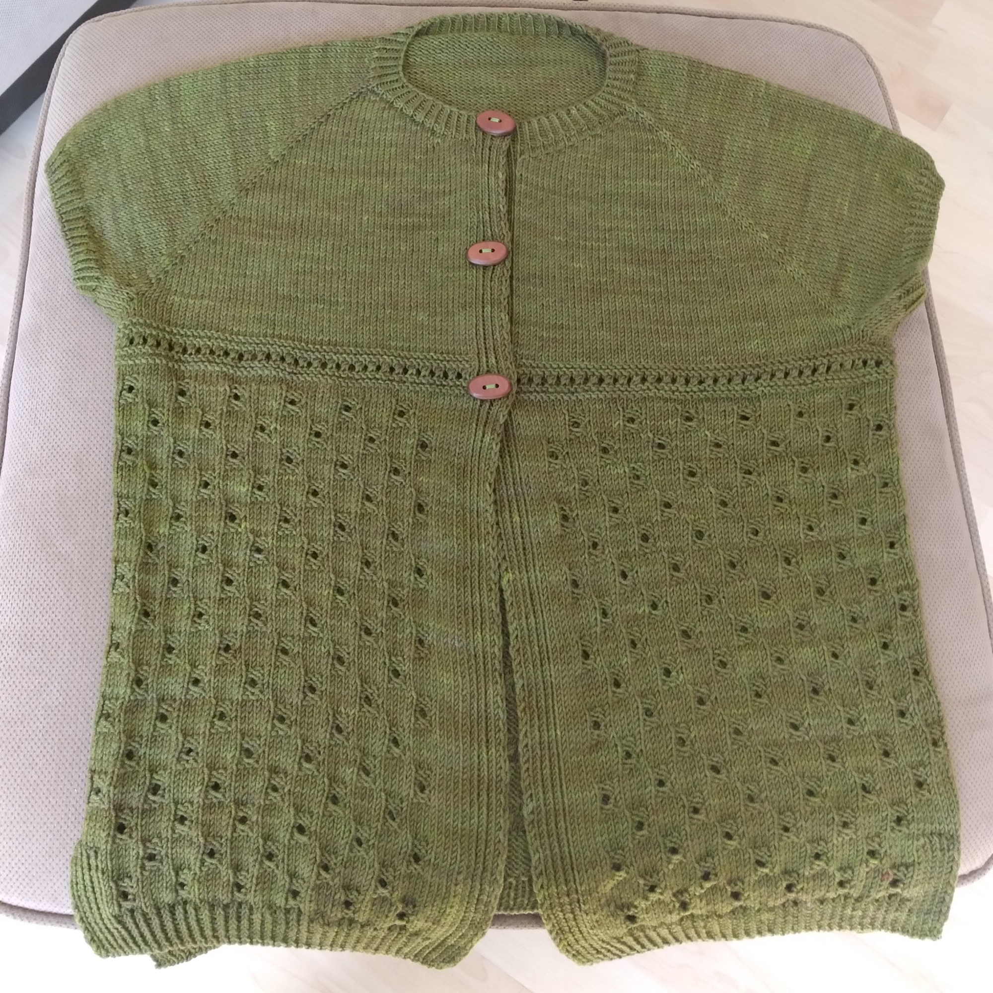 Puis, avec de la Alyster de Sac’Amé, je l’ai recommencé pour ma version finale. C’est bien beau le « coloré », mais pas terrible pour démontrer le point. Franchement, je le porte beaucoup. Il fait bien, est tout-aller et confortable. Et les magnifiques boutons sont de la Trukerie.