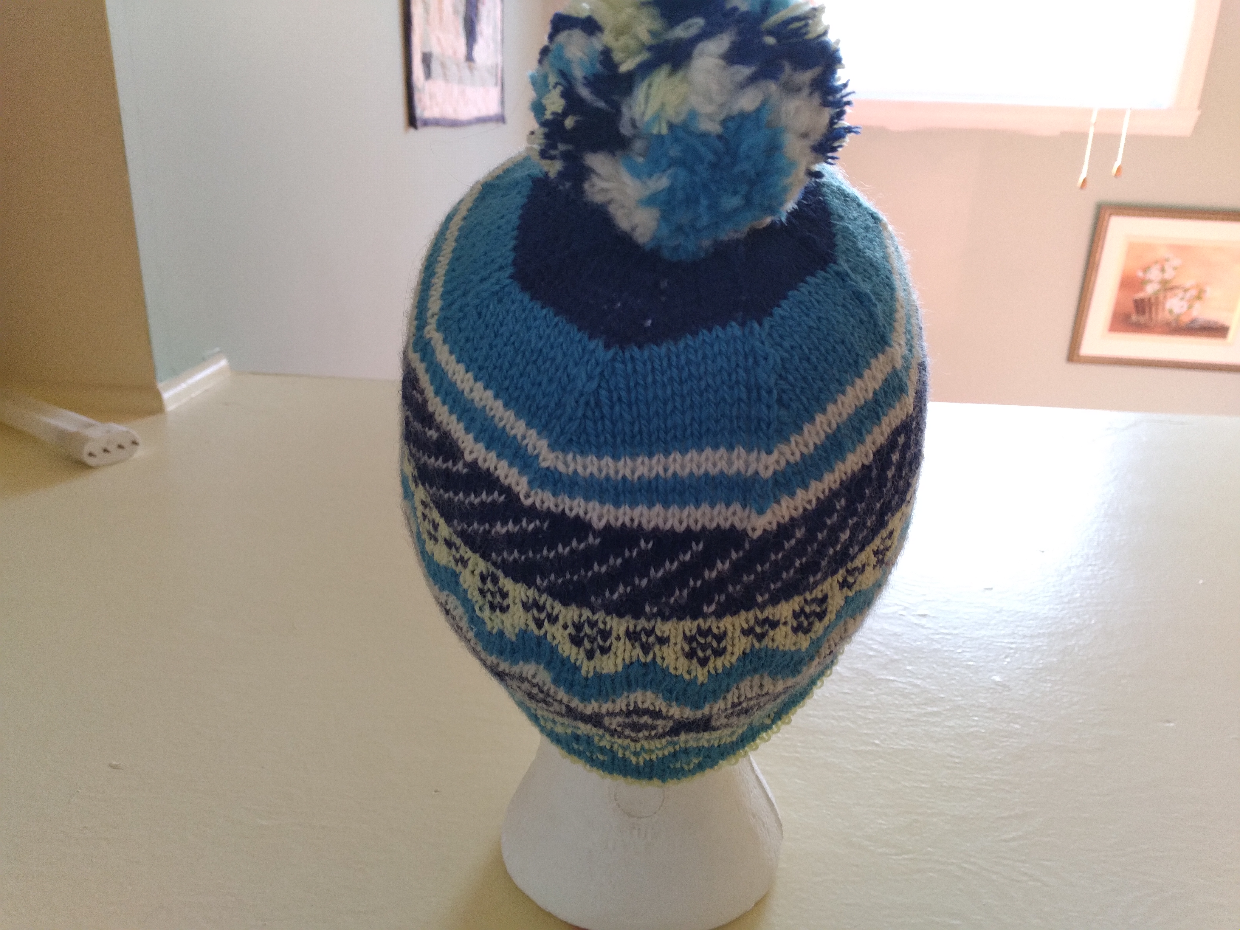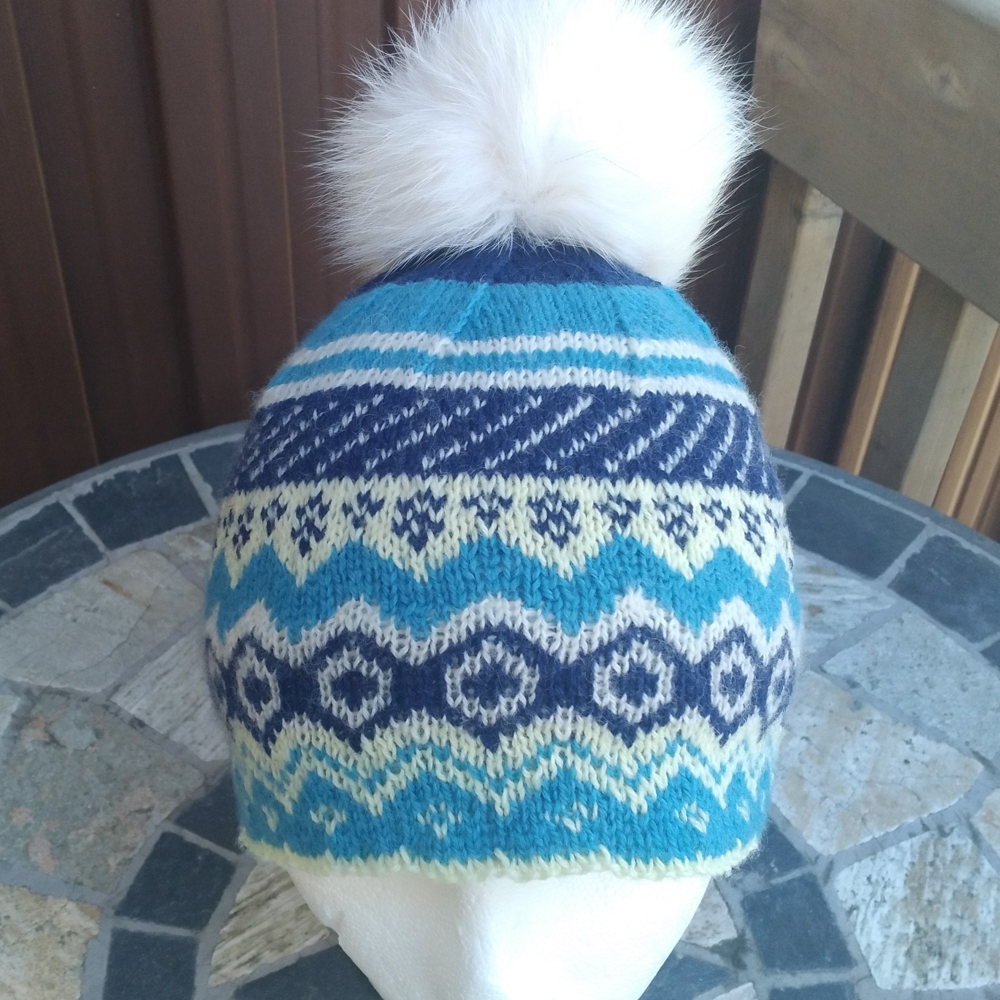Alors voici la tuque Merlin, dans la même laine. C’est une laine grosseur no 1 (fingering) non-traitée, et une aiguille circulaire de 3 mm et 40 cm de long, pour la majeure partie. Avec 2 écheveaux de 100 g chaque, un pour la principale (la pâle) et un autre pour la contrastante, vous en avez amplement pour les 2 morceaux.