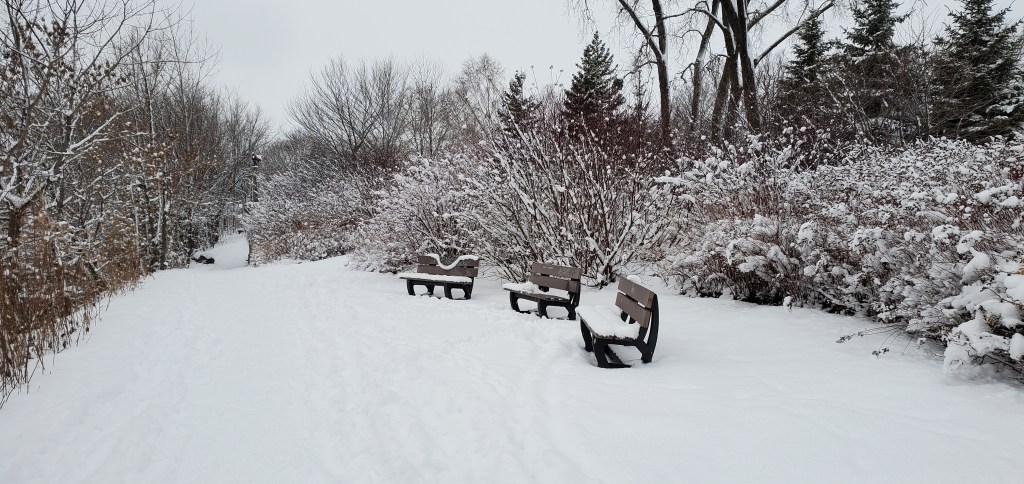 Un coin de la piste cyclable et piétonne (en hiver seulement piétonne, devinez pourquoi) qui longe la rivière St-Charles à Québec.