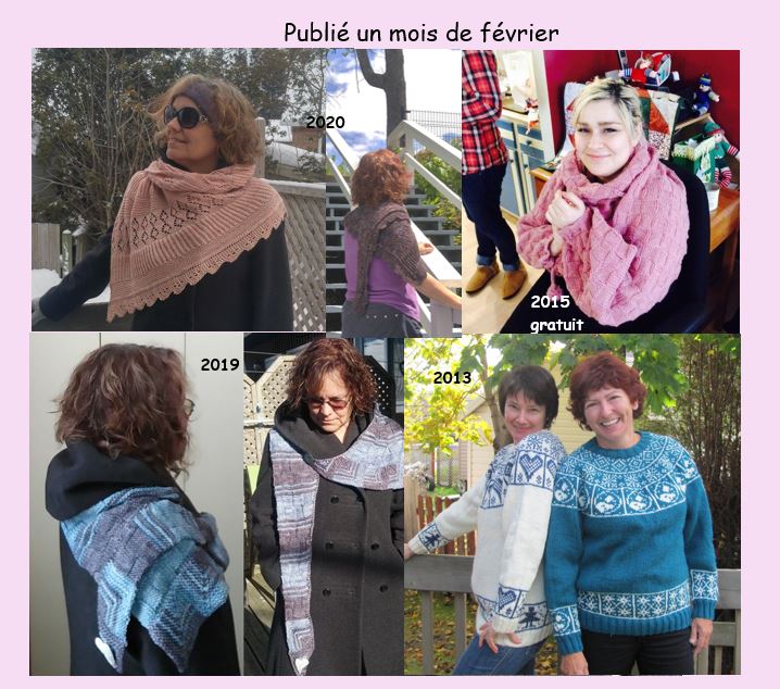 Mes cours se poursuivent jusqu’en avril. Voici quelques oeuvres des mes élèves (Maison Routhier), certains de mes patrons de base, de mes patrons sur ravelry (ou même exclusifs à mes cours) et d’autres de leurs patrons choisis. J’ai des élèves dans tous les niveaux.