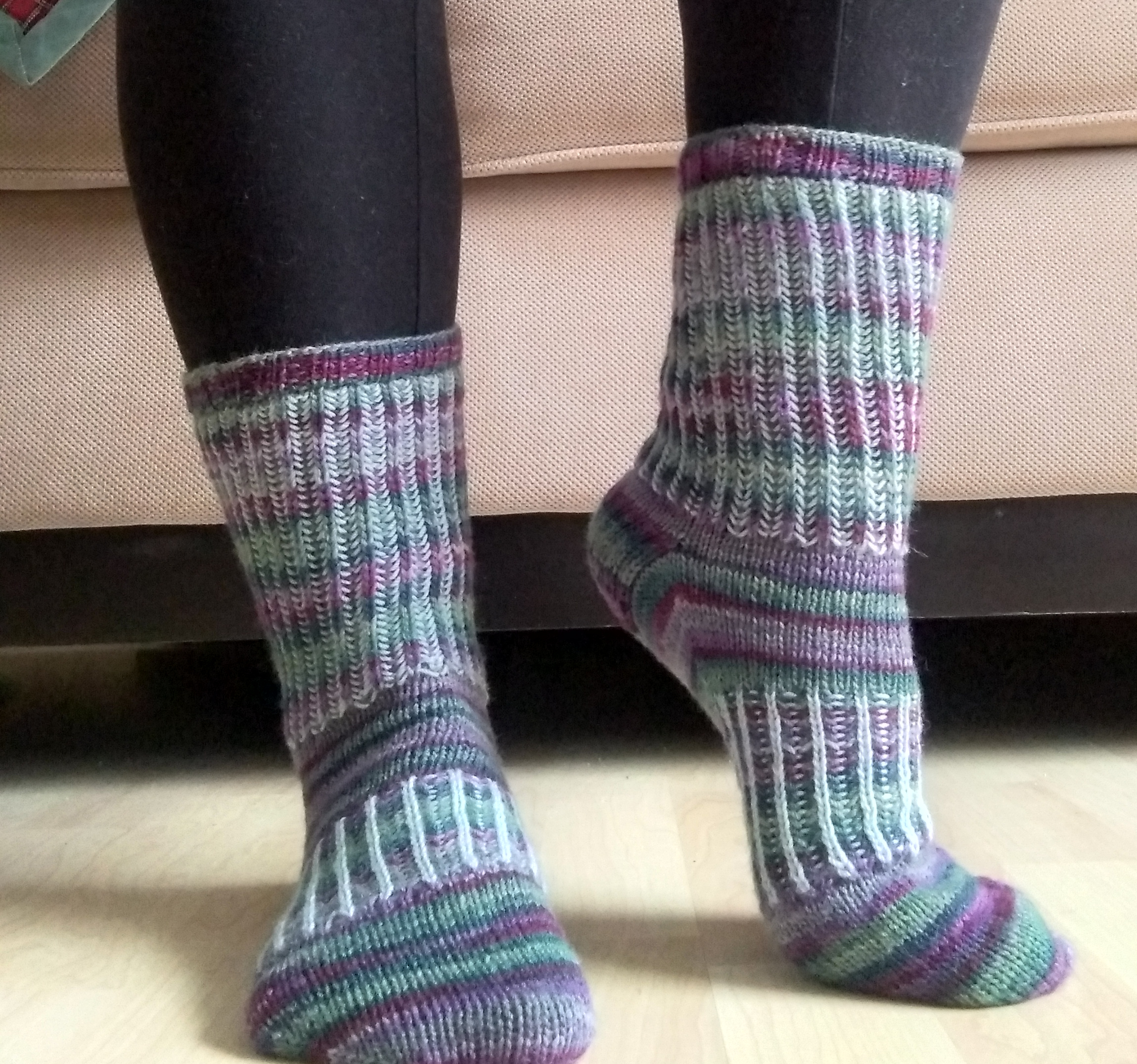 Note dans le patron, au sujet des mailles glissées de la semelle. Je voulais montrer un petit détail que je n’ai pas pu illustrer dans le patron: Dans le pied, on a du tricot brioche sur le dessus, mais des mailles glissées en-dessous (c’est plus lisse sous le pied). Dans le patron, j’explique qu’on peut faire un rang tout endroit (pour le dessous seulement). Mais voici les différences de manières de le faire: à gauche, juste une fois de temps en temps, et pas la même couleur (c’est assez discret). Au centre (et celui de gauche dans les violets), les rangs unis ont été faits successivements, et 2 fois: c’est joli hein?. Et le bas de droite, on n’a que des mailles glissées partout: on voit que ça tire un tout petit peu, mais ce n’est vraiment pas grave. Sauf que c’est la raison pourquoi j’ai préféré « couper » quelques fois les sections de mailles glissées par des sections unies.