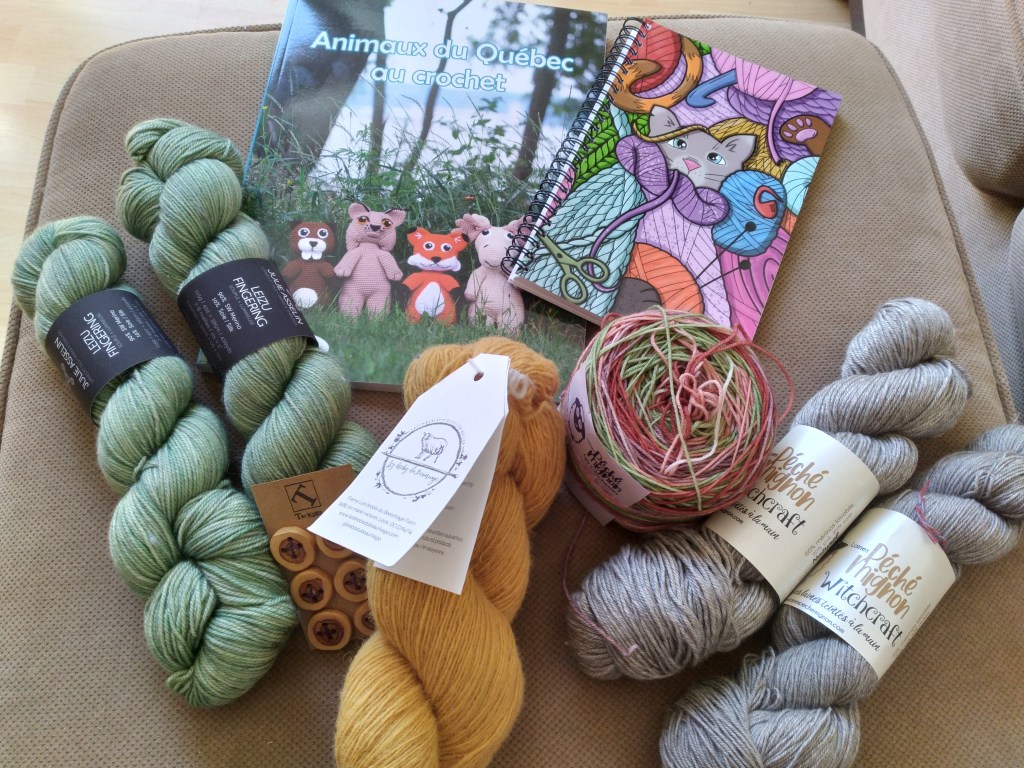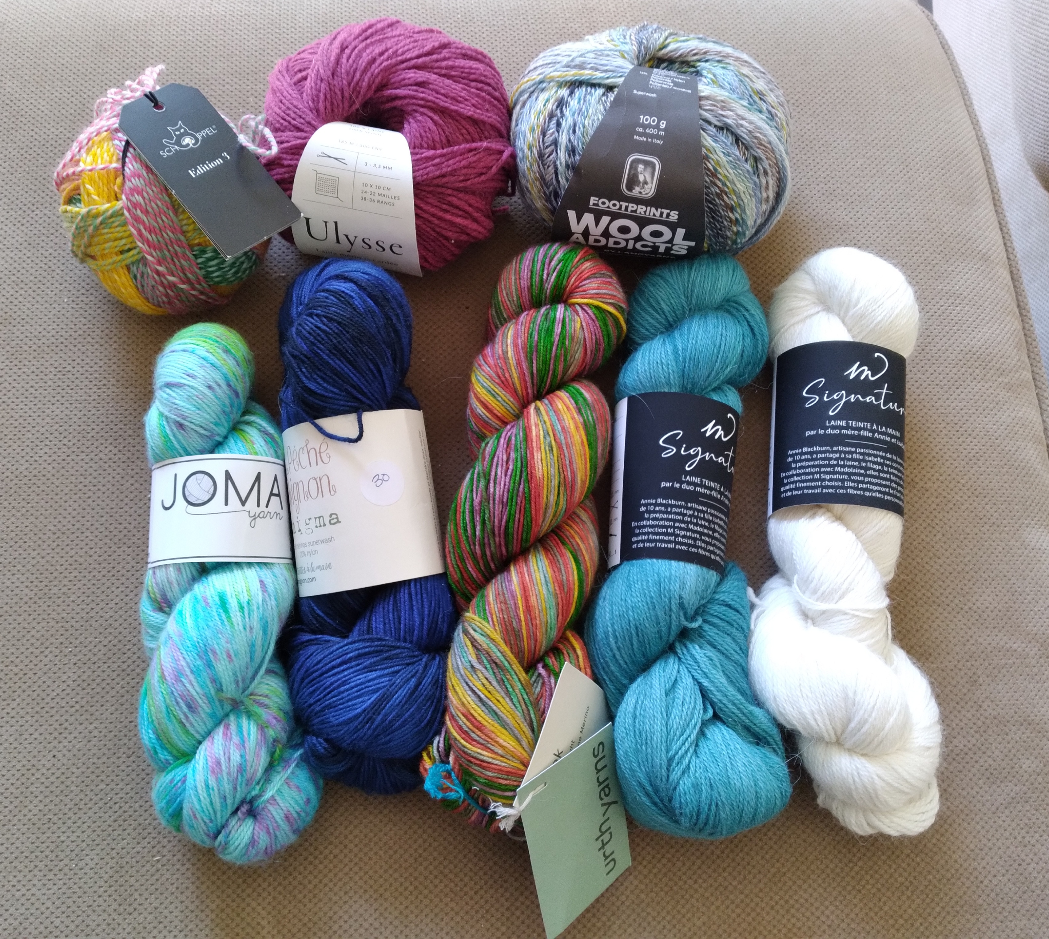 Je vous présente mon butin, parce que oui, mon cours terminé, j’ai déambulé dans les 2 salles d’expositions. J’ai acheté: Julie Asselin, Trukerie, Laines Péché Mignon, Les Brebis du Beaurivage, le livre de l’Accroche Laine et un petit cahier de l’Amas de Laine.