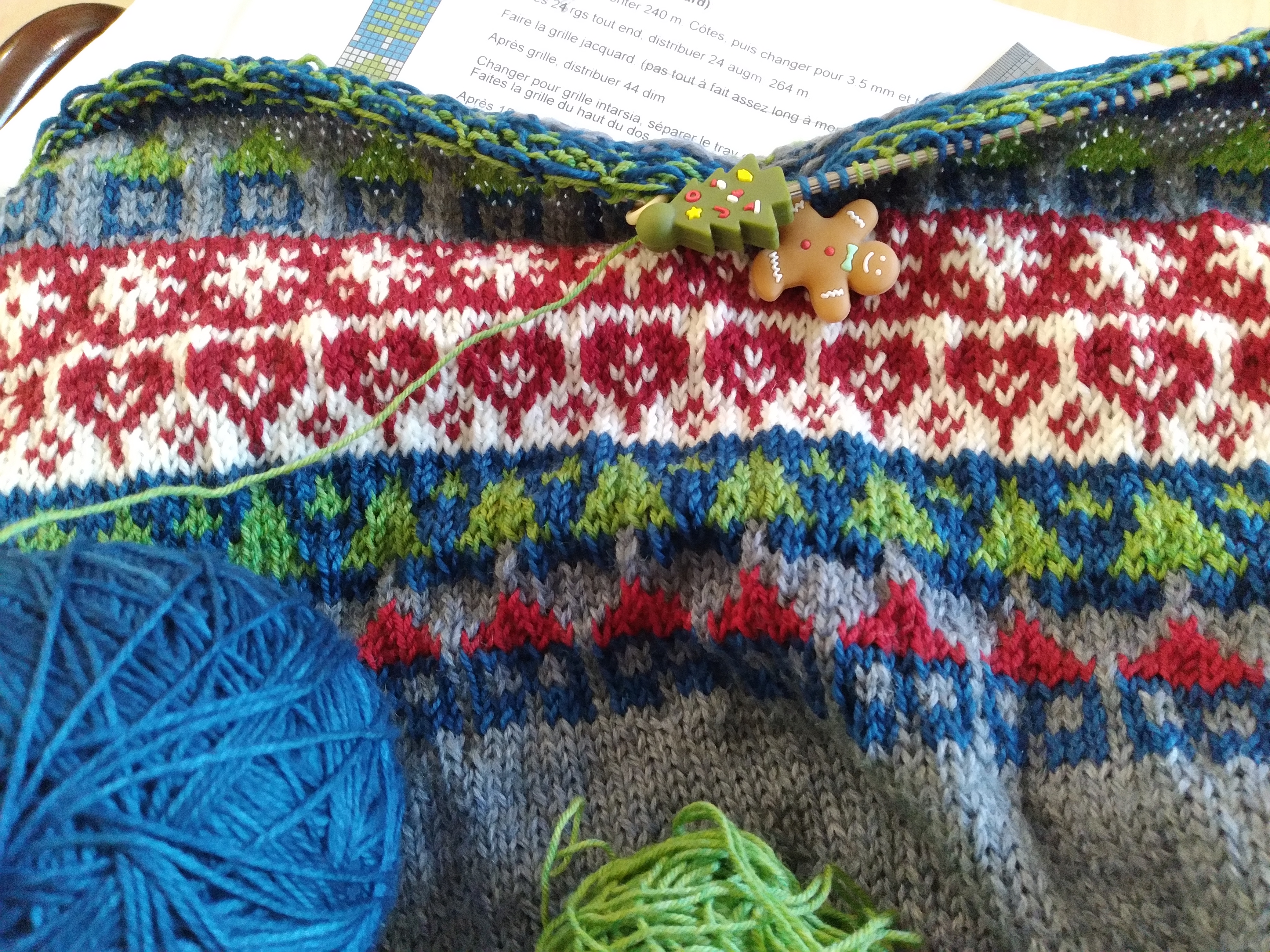 Quelques tricots des semaines passées: mitaines du Livre à colorier (pour tricoter) de mitaines d’Aleks Byrd, un début de chandail inventé qui fera un peu Noel et, oui, le même bas qu’une de mes élèves plus haut, car c’est par ça que tout a commencé.
