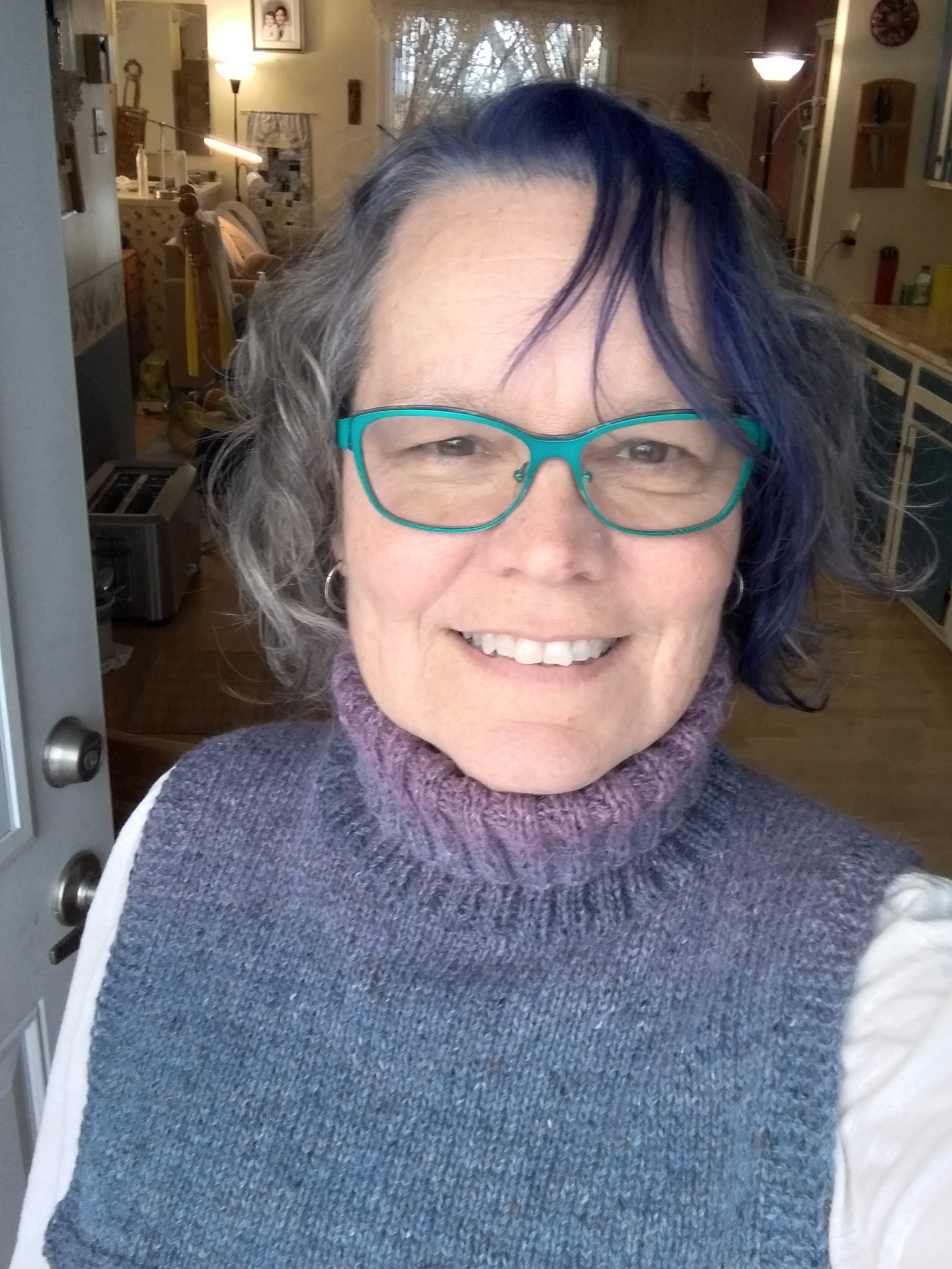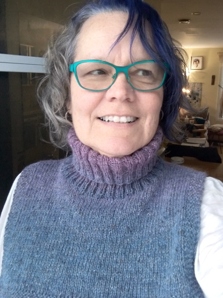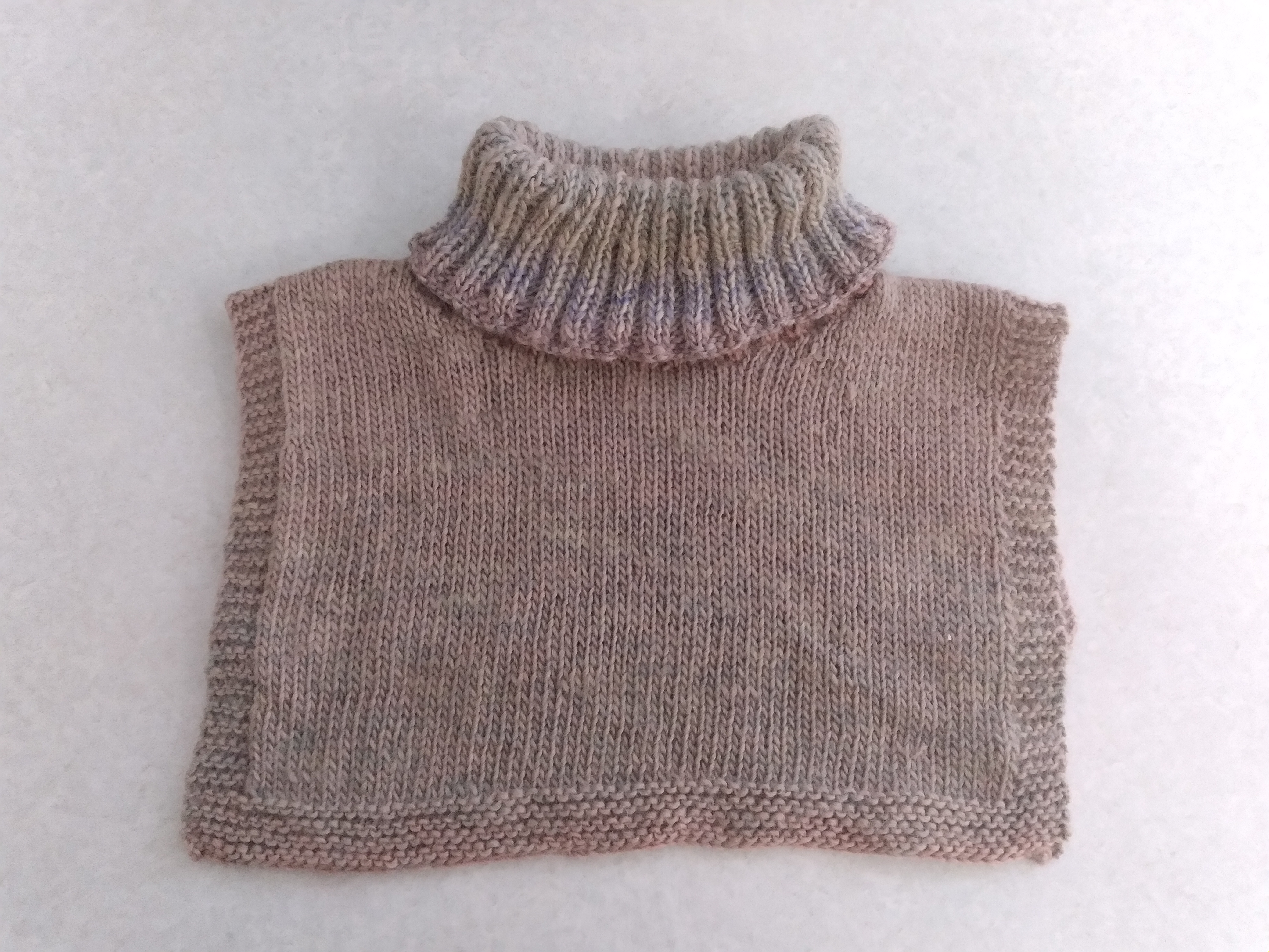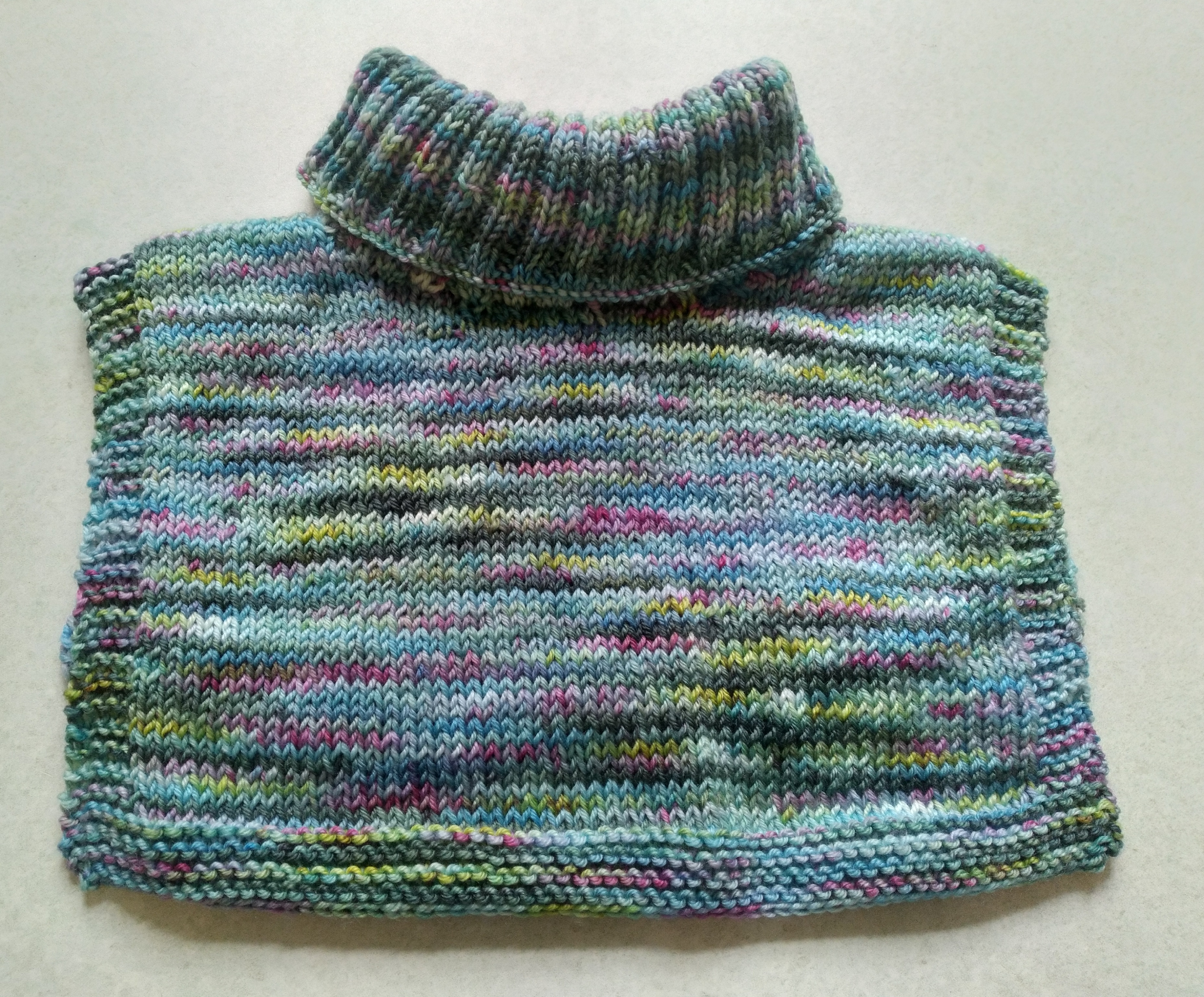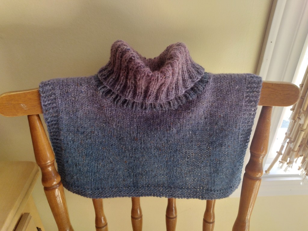 D’abord concocté en laine moyenne (worsted) et avec des coutures aux épaules, je l’ai modifié afin qu’il soit sans coutures, et avec une laine un peu plus fine.