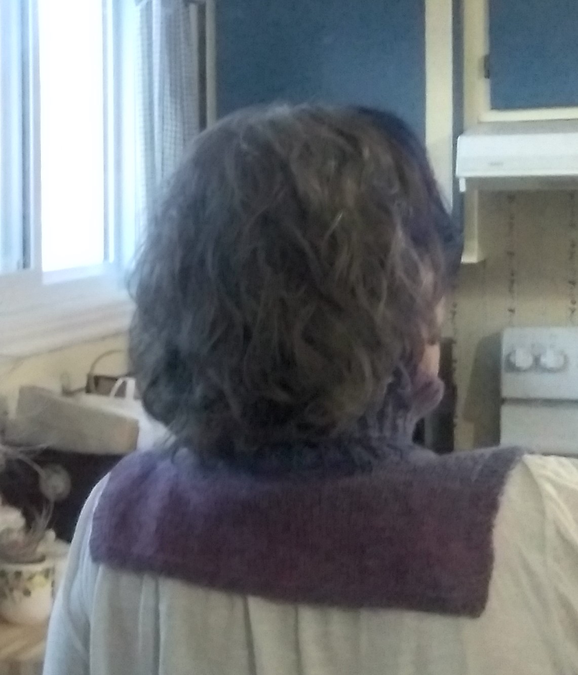 J’ai utilisé la Rowan felted tweed color, achetée chez La Vie Laine à Rimouski (mais commandé en ligne). C’est une laine qui prend 50 g (plus de 100 mètres) à déployer son changement de couleur. Moi je trouve que ça contribue à son effet. Avec une laine à dégradé plus rapide, il y aurait une démarcation à une épaule.