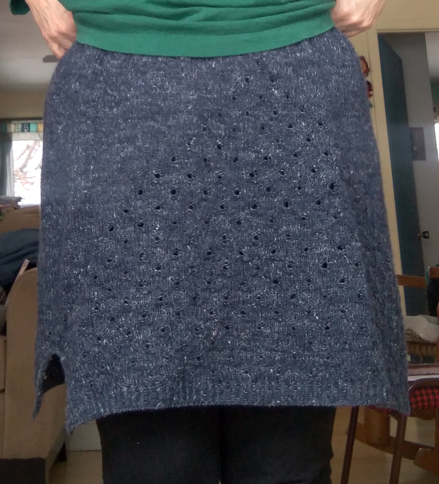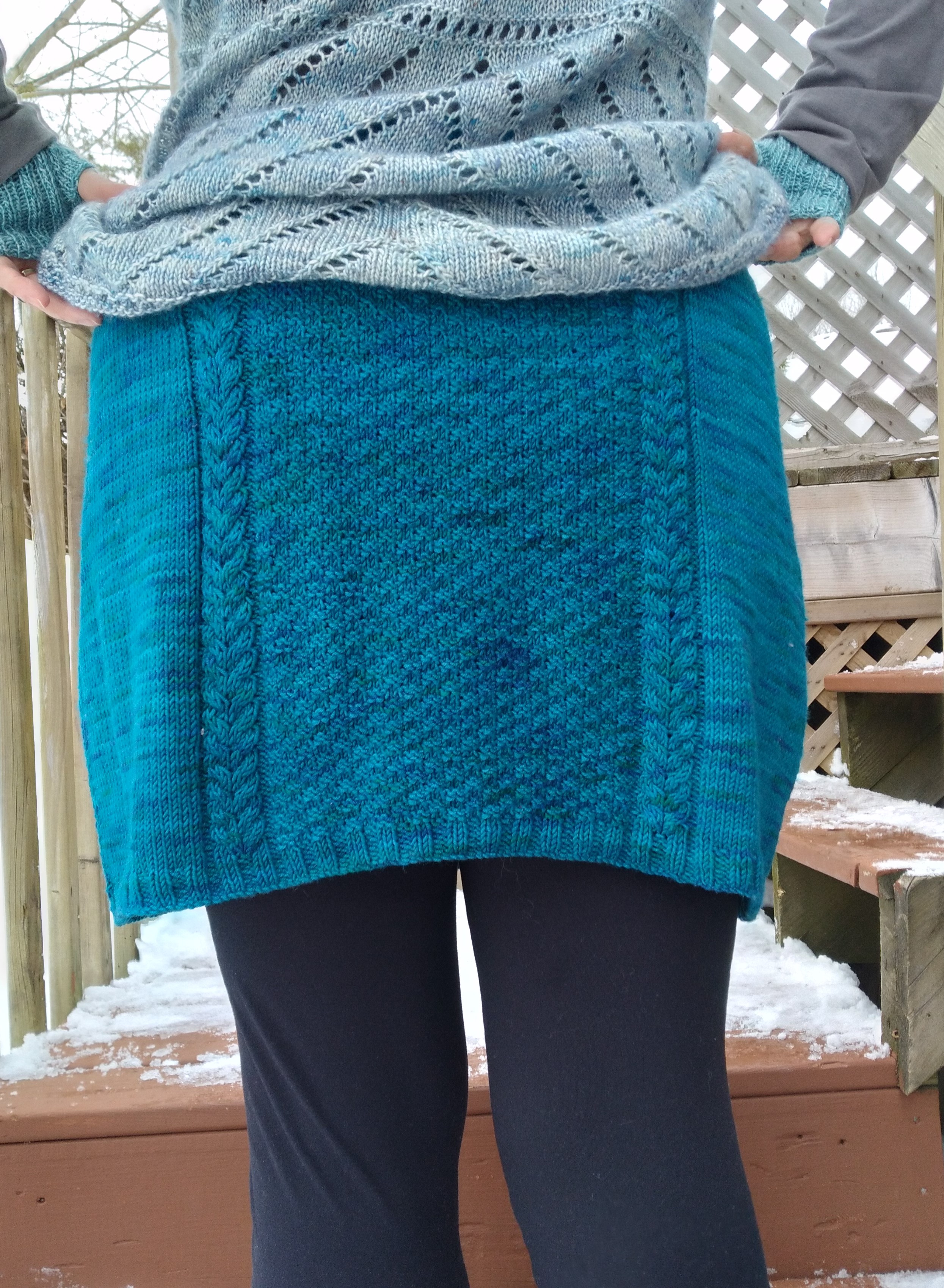 Ouais mes photos ont été prise l’hiver, mais ça se porte bien toutes les saisons. Je vous le dis: ce n’est pas pour rien que je suis dans une phase de création de patrons de jupe, j’adore en porter! En prime, ici haut’ le modèle de Gina Morin de Artigina (avec le jaune et orangé pour le jacquard).